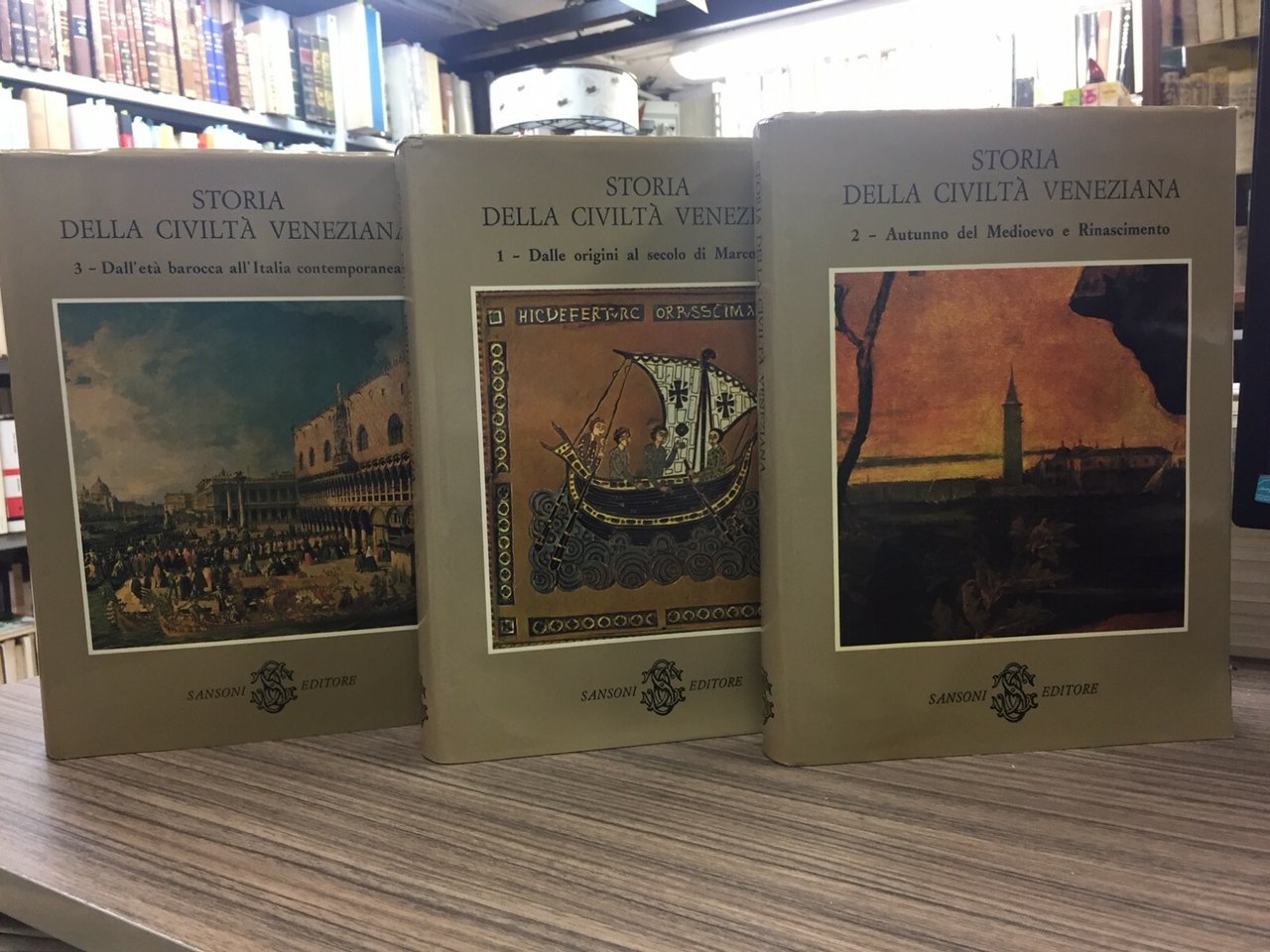 I. Dalle origini al secolo di Marco Polo. II.Autunno del Medievo e Rinascimento. III. Dall'età barocca all'Italia contemporanea. Firenze. Sansoni 1978, 8°, pp. 460+384+436, con centinaia di figure in nero f.t. Leg. Edit., sovracc. Segni del tempo. Buon esemplare.
