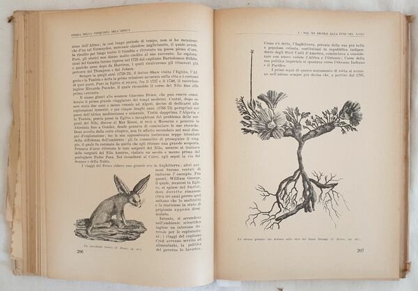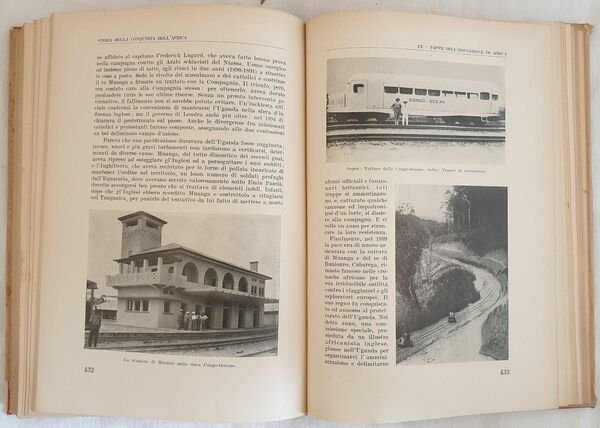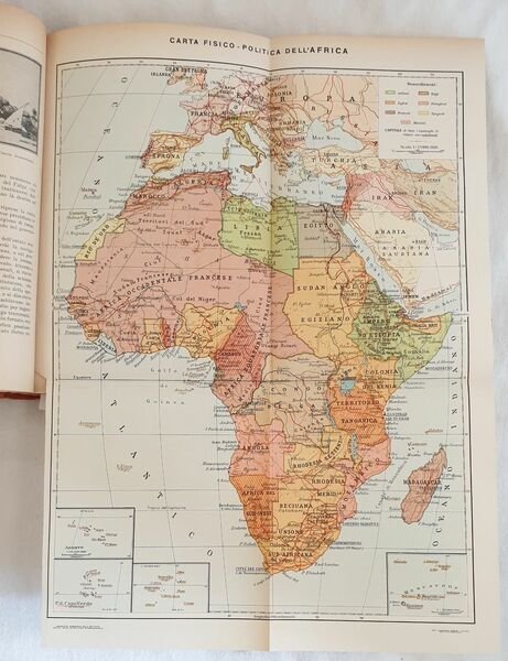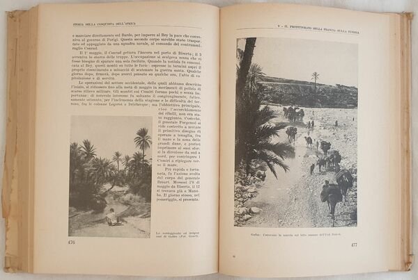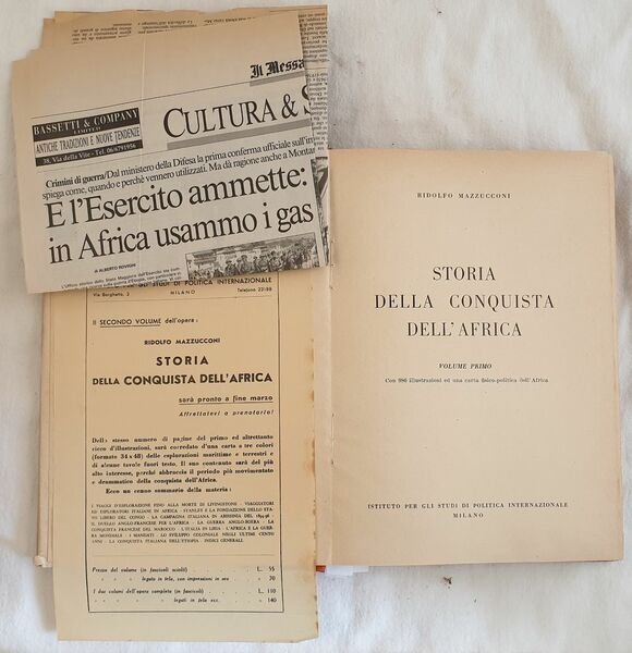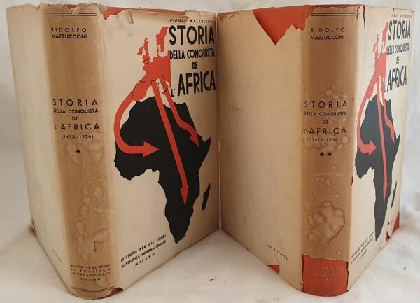 Edizione del 1937 di questa opera sulla storia della conquista dell'Africa scritto da Ridoldo Mazzucconi.<BR>L'opera è composta da due tomi ed è completa. Insieme al volume volantino pubblicitario per la prenotazione dell'opera e alcuni ritagli di giornale.<BR><BR>L'opera è una dettagliata analisi delle conquiste in territorio africano dal principio del secolo XV. All'interno: L'africa dal principio del secolo XV fino alla fine del secolo XVIII, L'Africa nel periodo napoleonico, conquista francese dell'Algeria, Taglio dell'Istmo di Suez, Protettorato della Francia in Tunisia, Occupazione inglese dell'Egitto, L'Italia nel Mar Rosso, la spedizione inglese contro il Negus Teodoro, Contributo degli italiani alla conoscenza dell'Africa, Competizione europea per l'Africa, espansione tedesca in Africa, SEconda guerra italo abissina, azione italiana in Somalia, Da Cartuma Fascioda, Guerra Anglo Boera, Occupazione italiana della Libia, Altre tappe dell'espansione in Africa dell'Inghilterra Francia e Spagna, Conquista italiana dell'Etiopia ecc. Interessanti cenni sull'etnografia e le famiglie linguistiche africane. Numerose foto e illustrazioni in bianco e nero e mappe ripiegate. Antica firma datata 1942. In buone condizioni. Copertina in tela editoriale con sovraccoperta in buone condizioni generali con lievi usure ai margini e dorso. Mancanze. Legatura in buone condizioni. Pagine in ottime condizioni con rare fioriture. In 8. cm 27x20. Pp. 616, 619. Peso Kg. 3,850. Edition of 1937 of this work about the history of conquer of Africa written by Ridoldo Mazzucconi. The work is made up of two tomes and it is complete. Together with the volume and advertising pamphlet volantino pubblicitario to buy the work and some clippings. The work is a detailed work of conquer in Africa from the beginning of 15th century. Inside: Africa from early 15th century until the end of 18th century, Africa during Napoleon period, french conquer of Algeria, Istmo di Suez, France conquer in Tunisia, English occupation of Egypt, Italy in Red Sea,English expedition against Negus Teodoro, Contribute of italians to knowledgement of Africa, European compeetition for Africa, german expansion in Africa, SEcond italian abyssianian war, italian action in Somalia, From Cartum to Fascioda, Anglo Boer war, Italian occupation of Lybia, Expansion in Africa of Englanf France and Spain, Italian conquer of Aethiopia ecc. Interesting information about ethnography and african linguistic families. Different photos and illustrations and folded maps. Antique signature dated 1942. In good conditions. Cloth editorial cover with dustjacket in good conditions lightly worn in the exremities. Lackings. Binding in good conditions. Pages in very good conditions with occasional foxing. In 8. cm 27x20. Pp. 616, 619. Weight Kg. 3,850
