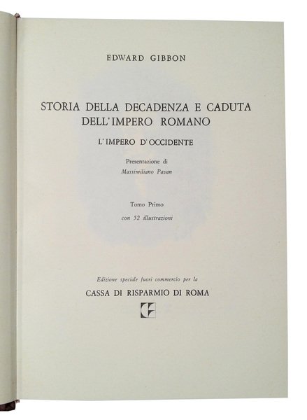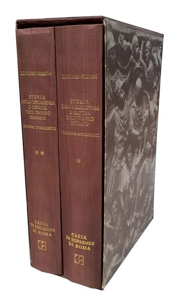 in-8° (260x180 mm); leg. in seta editoriale colore marrone, con titoli in oro ai dorsi (leggera scoloritura al dorso); controguardie e guardie libere in carta bianca; cofanetto di custodia in cartone rivestito con seta e carta, illustrato in color seppia; 2 vol.; pp. XXIV, 829, [4] c. di tav.; 831-1630, [8] c. di tav.; oltre alle tavole fuori testo, l'opera è arricchita da 107 tavole illustrative in b/n nel testo (52 nel primo tomo e 57 nel secondo). Edizione speciale fuori commercio di 5000 copie di questa corposa opera storica sulla decadenza dell'impero romano d'occidente, finita di stampare il 30 ottobre 1981 dalla Tipografia "La Grafica" in Perugia per conto della Casa editrice "Biblioteca di storia patria" in Roma. Edward Gibbon (1737–1794) fu uno storico e scrittore inglese. Membro del Parlamento britannico, la sua opera più importante e famosa, The History of the Decline and Fall of the Roman Empire, pubblicata in sei volumi dal 1776 al 1788, si distingue per la qualità e l'ironia della prosa, e per le critiche indirizzate alle confessioni religiose. Rif.: IT\ICCU\IEI\0124832. OCLC, 635997311. Cond.: Opera molto raffinata ed in perfette condizioni. -- SPECIAL EDITION OF 5000 COPIES OF THIS SUBSTANTIAL HISTORICAL WORK ON THE DECLINE OF THE WESTERN ROMAN EMPIRE. Very fine work, in perfect condition.