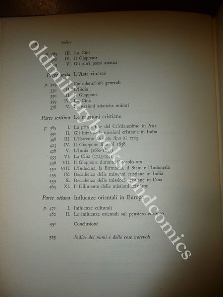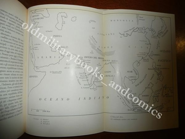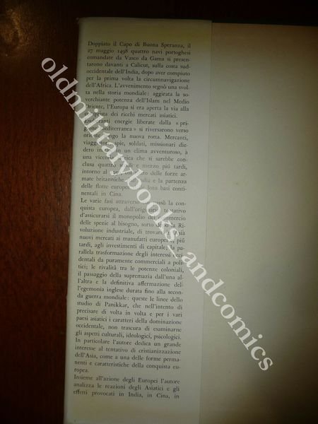 DESCRIZIONE: Einaudi Torino 1958 I^ Ediz., br. ed. con sovracc. ill. pp. 542 in 8°, 35 ill. b/n e col. f.t. e 2 carte rip. La storia dei rapporti tra occidente e oriente in Asia vista dagli asiatici, ovviamente molto critica della politica colonialista delle potenze europee. L'autore è uno studioso indiano formatosi in occidente. Quando Vasco da Gama doppiò il Capo di Buona Speranza e approdò in India, si aprì una fase storica nuova, caratterizzata dalla conquista europea dei ricchi mercati asiatici. Il ciclo, che passa attraverso il colonialismo e le rivalità tra le grandi potenze, si conclude a metà del '900, con il ritiro delle forze britanniche dall'India. CONDIZIONI: Buone/Ottime, sovracc. con evidenti sttrappetti, ombrato, per il resto ottimo. PESO / WEIGHT: 920 gr. without package