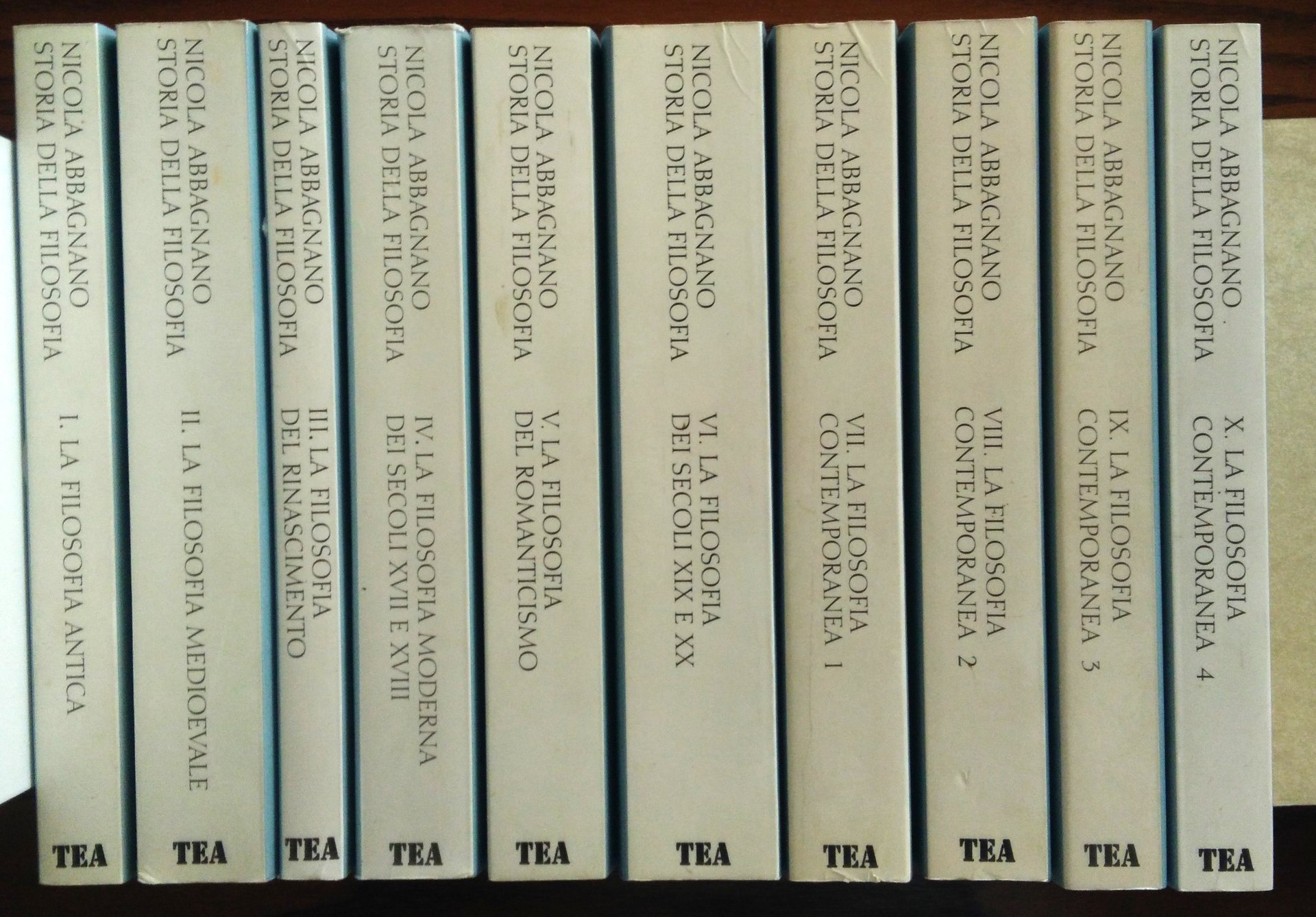 S. L., TEA, 1995-1996. 16°, dieci volumi, brossure editoriali. Volume PRIMO, La filosofia antica. Dalle origini al Neoplatonismo, pp. XII, 290. - Volume SECONDO, La filosofia medioevale. La Patristica e la Scolastica, pp. 461. - Volume TERZO, La filosofia del Rinascimento, pp. 201. - Volume QUARTO, La filosofia moderna dei secoli XVII e XVIII. Da Descartes a Kant, pp. 415. - Volume QUINTO, La filosofia del Romanticismo. Da Fichte a Nietzsche, pp. 417. - Volume SESTO, La filosofia dei secoli XIX e XX. Dallo Spiritualismo all'Esistenzialismo, pp. 553. - Volume SETTIMO, La filosofia contemporanea 1. Di Giovanni Fornero, pp. 502. - Volume OTTAVO, La filosofia contemporanea 2. Di Giovanni Fornero, pp. 477. - Volume NONO, La filosofia contemporanea 3. Di Giovanni Fornero, Franco Restaino e Dario Antiseri, pp. 408. - Volume DECIMO, La filosofia contemporanea 4. Di Giovanni Fornero e Franco Restaino, pp. 392. Ottima copia.