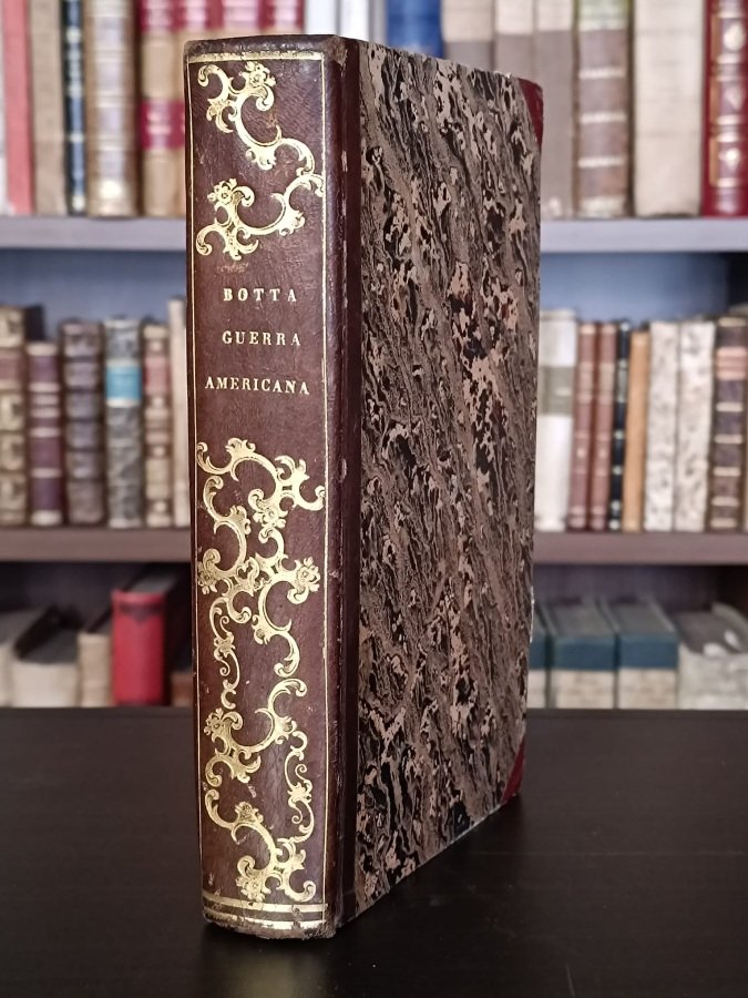 In-8° (cm. 22,2), legatura coeva in mezza pelle, dorso liscio con titolo e fregi romantici floreali in oro inquadrati da un filetto sempre in oro, piatti marmorizzati <span style="font-size: 13.333333px;">(lievi tracce d'uso),</span> tagli spruzzati in blu; pp. VIII 568 in buono stato (alcune fioriture sparse); con 14 tavole incise rame dal Verico fuori testo, di cui 1 ritratto dell'autore all'antiporta; lira silografica al frontespizio. Bella edizione di quest'opera sulla storia americana illustrata con tavole litografiche; testo su due colonne. Buon esemplare. (NK6)