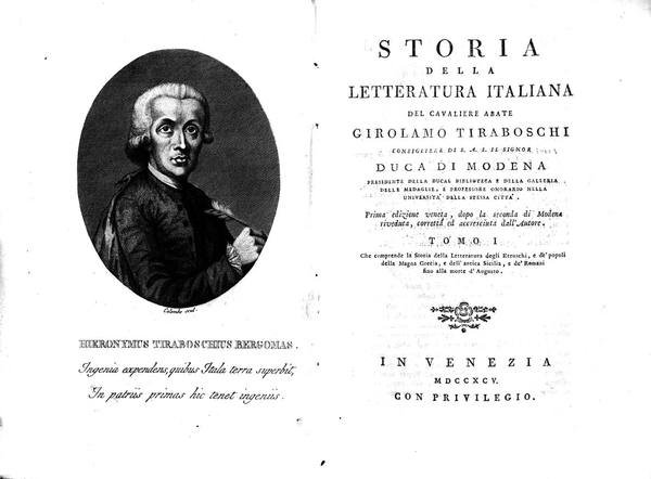 In-8 p. (mm. 220x153), 9 tomi in 16 volumi, cartonato coevo, tit. ms. al dorso, ca. 500 pp. cad., con ritratto dell'A. inc. in rame al primo tomo. Il tomo IX contiene l'Indice generale di tutta l'opera. "Gerolamo Tiraboschi passò nel 1770 a reggere la Biblioteca Estense. La sua opera maggiore fu la "Storia della Letteratura Italiana" (la seconda edizione ampliata è quella che fa testo e fu pubblicata dal 1787 al 1793). Essa è opera di consultazione nel suo genere e per il suo tempo perfetta, ancora indispensabile per la dovizia e la controllata esattezza delle notizie". Così Diz. Treccani,XII, p. 196.mplare ben conservato.