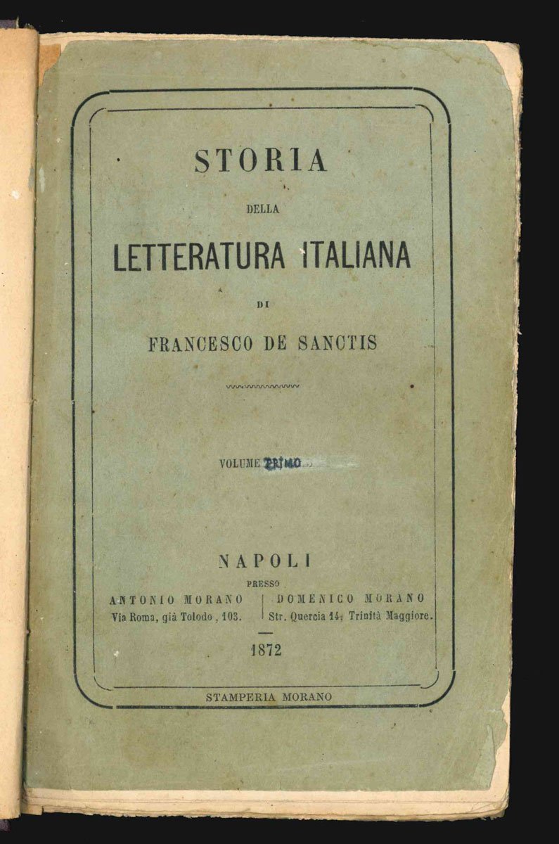 LIBROEdizione originale.Rarissima princeps della più influente storia della letteratura italiana dell’Ottocento, ripubblicata da Croce nel 1925 e alla base della teoria crociana della letteratura, che informò decine di studiosi per tutto il primo Novecento. Il libro è oggi considerato un classico esso stesso, e ripubblicato in varie forme e da vari editori, tra cui anche nella prestigiosa «Pleiade» italiana di Einaudi e Gallimard. -- Fu ripubblicato in seconda edizione appena tre anni dopo, nel 1873, dallo stesso Morano. -- Curiosità: in quest'opera compare la frase «il fine giustifica i mezzi» che De Sanctis usa come esempio errato di come riassumere il pensiero di Niccolò Machiavelli, e che è stata successivamente attribuita erroneamente proprio al pensatore fiorentino.