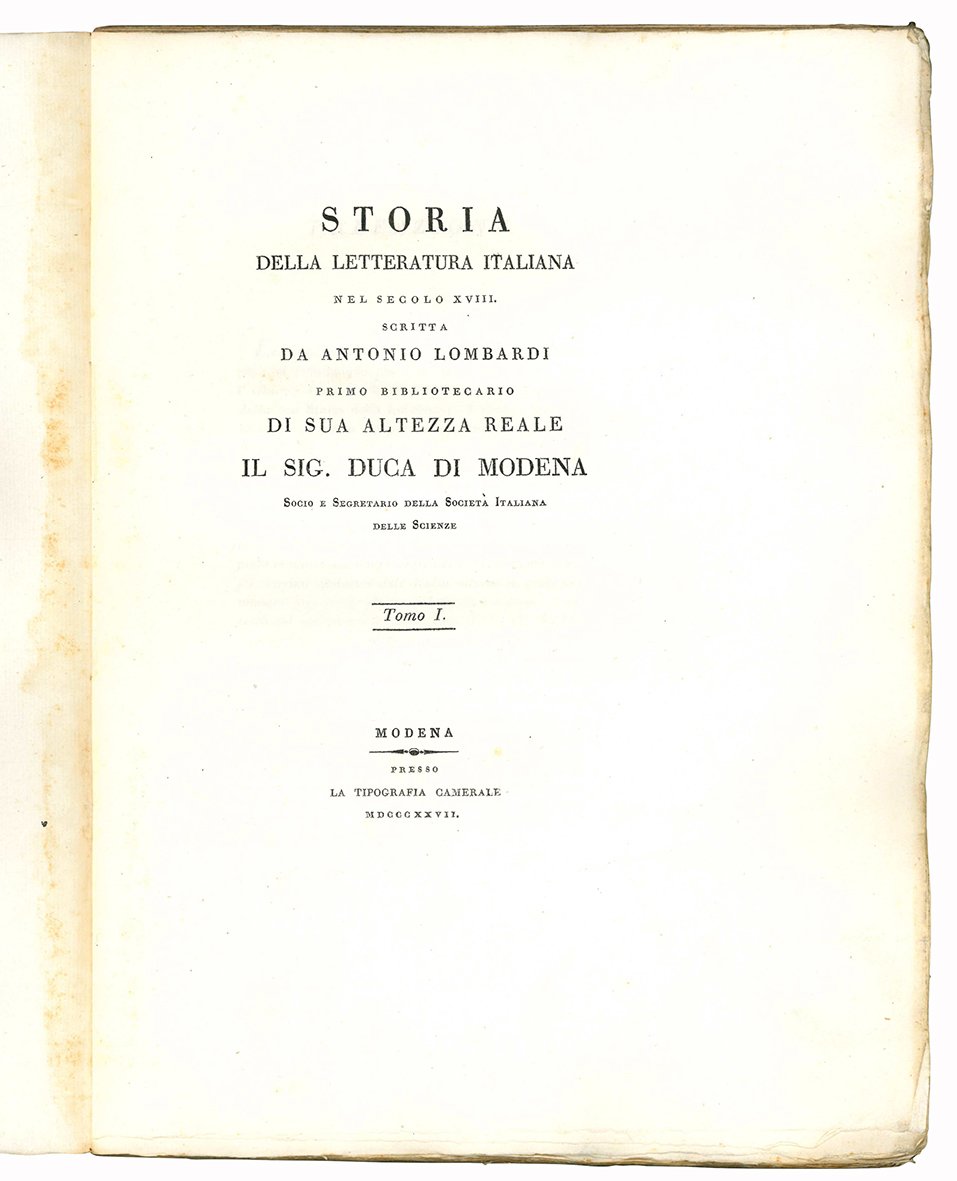 Storia della letteratura italiana nel secolo XVIII. Scritta da Antonio Lombardi primo bibliotecario di sua altezza reale il sig. Duca di Modena socio e segretario della Società Italiana delle Scienze. Tomo I [-IV]