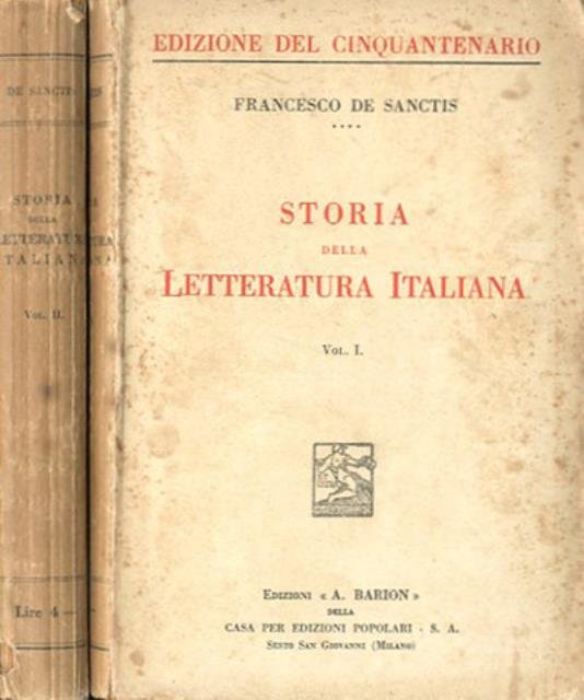 Edizione del Cinquantenario. 2 v. (366; 365 p.) ; 19 x 13 cm. "La singolarità di quest'opera consiste nell'essere insieme una storia della letteratura e una storia della vita morale del popolo italiano. La preoccupazione moralistica può parere qua e là che deformi la visione dello storico letterario; ma, invero, bisogna riconoscere che ogni storico traccia sempre la storia di un suo mito. Senza quel mito di un'Italia che decade per eccesso di letteratura, e che la grandezza drammatica della storia italiana risiede in questa antinomia fra lo splendore dell'ingegno e la decadenza politica, non avremmo avuto un'opera così compatta e così eloquente." (Luigi Russo). Brossura editoriale, coperta in cartoncino flessibile con titolo impresso in rosso al piatto e in nero al dorso. Segni evidenti del tempo (fioriture e ingiallimento della carta) sia alla coperta che al dorso e alle pagine interne. Libro da studio. Codice libreria 3950.