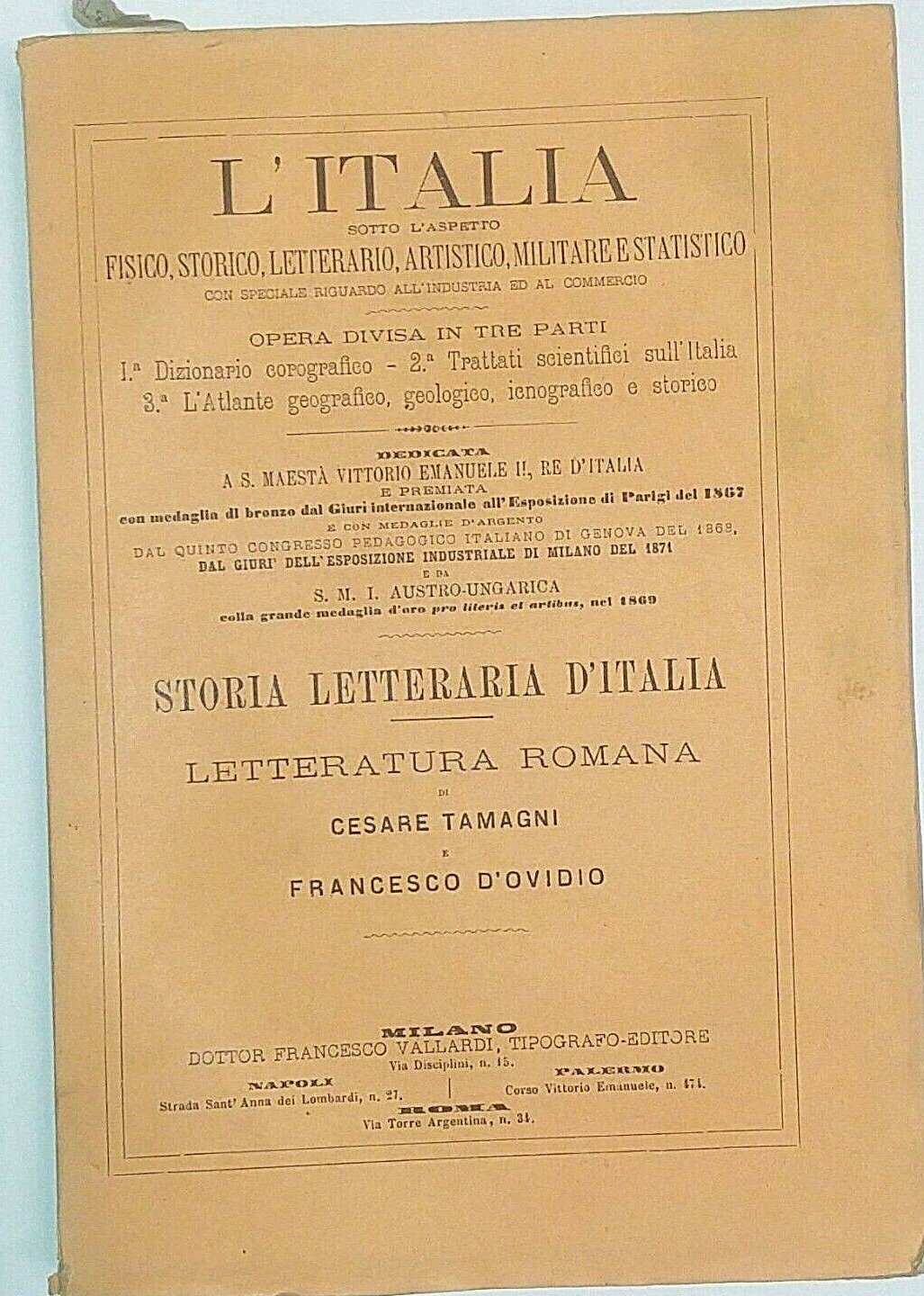 STORIA DELLA LETTERATURA ROMANA Tamagni D’Ovidio 1874 Vallardi libro saggistica