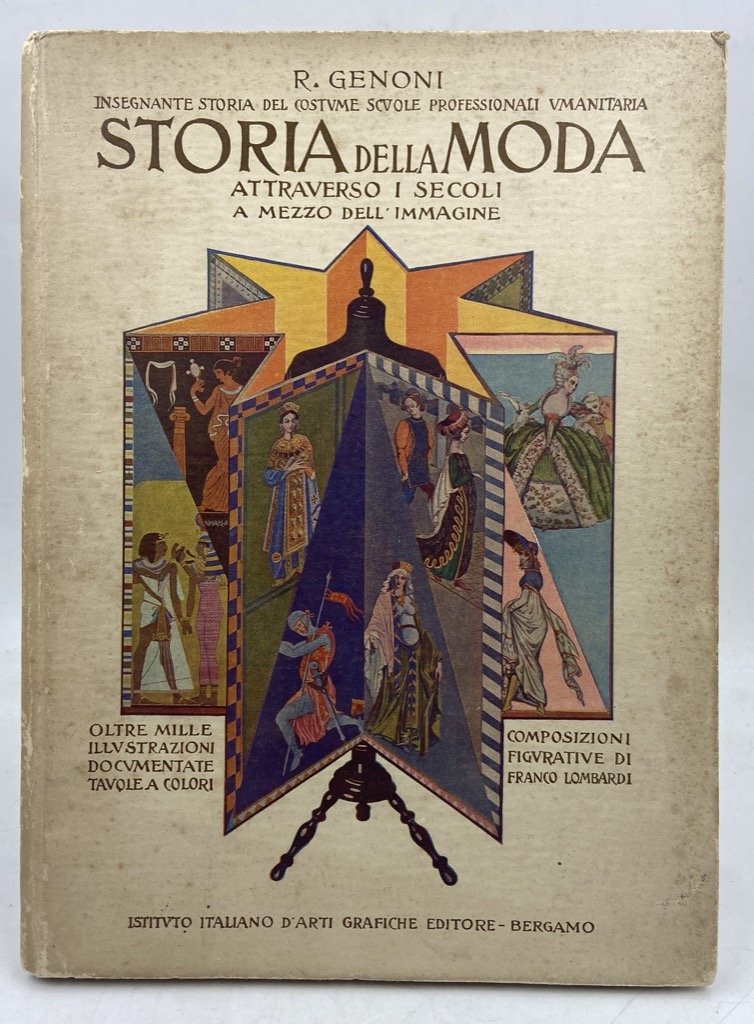 Cartonato editoriale illustrato, cm 27 x 20, pp XVI 104 (10), 400 illustrazioni nel testo, 8 tavole a colori e 2 tavole ripiegate di cartamodelli. Ben conservato. Edizione originale dell’unico volume pubblicato della Storia della Moda di Rosa Genoni, sarta e stilista madre del Made in Italy, educatrice e attivista, unica italiana al Congresso Internazionale delle Donne dell’Aja del 1915, militante nel movimento per la pace e antifascista (il che le costò il ruolo di insegnante di costume nelle Scuole Professionali dell’Umanitaria, e la pubblicazione dei restanti volumi di quest’opera). Lo studio della storia dell’abbigliamento fu per Rosa Genoni tassello fondamentale nel proprio progetto, essenzialmente politico, di riforma della moda italiana: «Le vesti femminili devono innanzitutto plasmarsi e adattarsi alla persona fisica e psichica della donna che le deve indossare» dichiarò nel 1908 al Primo Congresso Nazionale delle Donne Italiane vestendo l’abito “Tanagra” che abbandonava corpetti e crinoline parigine per ispirarsi alle statuette in terracotta del terzo Secolo avanti Cristo. Il volume è illustrato da centinaia di fotografie e riproduzioni, e da alcune raffinate tavole di gusto deco’ di Franco Lombardi (1891-1943).