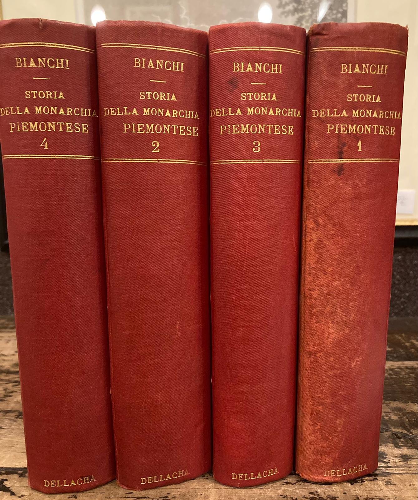 4 volumi in-8° (215x150mm), pp. XIV, (1), 679; (6), 750; (6), 686; (6), 723, (1); legatura novecentesca in tela rossa con titolo in oro sul dorso. Edizione originale, non comune, di quest'opera storico-diplomatica di considerevole estensione e documentazione, ricchissima di notizie economiche, statistiche, letterarie, artistiche, giuridiche, religiose, diplomatiche, etc. Appendice di documenti al III e IV vol. La storia si interrompe al 1814 a causa della morte dell'autore. L'opera fu tra l'altro confutata in un severissimo opuscolo, 'N. B. e la sua Storia della Monarchia Piemontese. Appunti di un elettore torinese' (Torino, Derossi, 1881), apparso anonimo, ma del marchese Vittorio Scati di Casaleggio, ed occasionato dai contrasti politici per le elezioni municipali del 1881. Il Bianchi (Reggio Emilia, 1818-Torino, 1886), fu storico e uomo politico, membro, nel 1848, del Governo provvisorio di Modena e Reggio, dal 1871 Sovrintendente degli Archivi di Stato del Piemonte, Senatore dal 1881, ammiratore e biografo di Cavour. Il suo lavoro storico maggiore è la 'Storia documentata della diplomazia europea in Italia dall'anno 1814 all'anno 1861' (1863-1872), basata su fonti di prima mano. 'Prendendo a narrare dall'inizio del regno di Vittorio Amedeo III.il Bianchi esamina ogni aspetto del Regno Sardo servendosi della ricca documentazione che l'Archivio di cui era direttore gli fornisce. Pur soffermandosi inizialmente con particolare gsto sulla corte, i suoi membri, i suoi costumi, passa presto a rendere segnatamente conto delle finanze, del catasto, del clero, della religiosità, della cultura, dell'esercito, della politica estera' (Diz. Biografico d. italiani, X, p. 62). Manno, I, 1102 e sgg. (cita gli opuscoli che stamparono, intorno al libro del Bianchi, il Claretta e lo Scati di Casaleggio, il primo elogiativo, il secondo aspramente critico): 'Questa storia, in corso di pubblicazione, è giunta al volume terzo. Essa fu composta su materiali di Stato, nuovi, inesplorati, in gran parte anche segreti. Procede parallelamente per epoche e per materie. Come tutte le grandi e laboriose imprese, diede luogo a svariati giudizi'. Mario Menghini in Enciclopedia Italiana, VI, 868. D.B.I., X, pp. 156-162. Per una bibliografia completa del Bianchi, G. Sforza in 'Rassegna storica del Risorgimento', 1917, pp. 213-266.