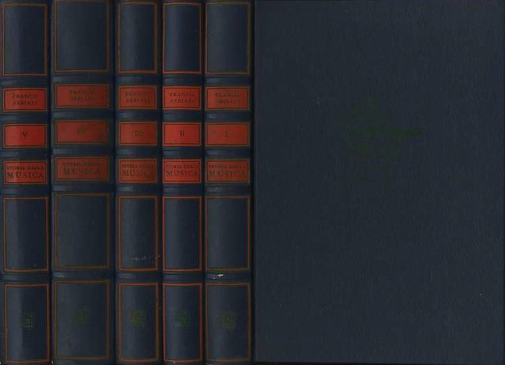 5 v. (553 p.; 470 p.; 537 p., 772 p., 596 p.), 27 cm, similpelle con dorso a cinque nervi con titoli oro. Condizioni : USATO - Stato : Buono, ordinari segni d'uso e del tempo. Altre note : Storia della musica a cura di Franco Abbiati (1898-1981), arricchita con tavole a colori, illustrazioni, citazioni e facsimili. L'opera in cinque volumi comprende: I. Roma, Medioevo, Rinascimento; II. Seicento; III. Settecento; IV. Ottocento; V. Novecento. IL PREZZO SI RIFERISCE AI 5 VOLUMI INSIEME.