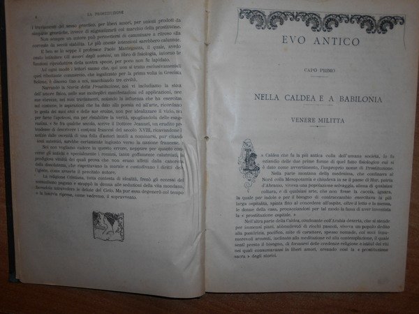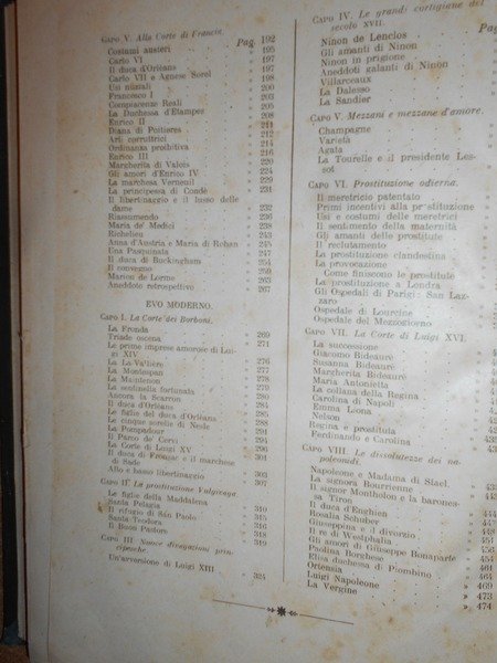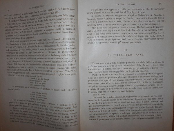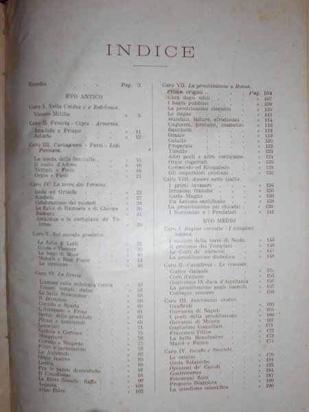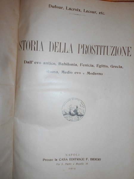 DUFOUR, LACROIX, LECOUR, etc. Napoli, Presso la Casa Editrice F. Bideri, 1914. STORIA DELLA PROSTITUZIONE. Dall' evo antico, Babilonia, Fenicia, Egitto, Grecia, Roma, Medio evo e Moderno. In-4°, m. tela coeva con titolo in oro al dorso. 474, (2 indice) pp. con numerose tavole in bianco e nero nel testo. Raro esemplare ben conservato. Neg. esot. basso mob. 72