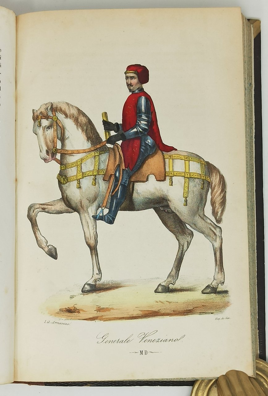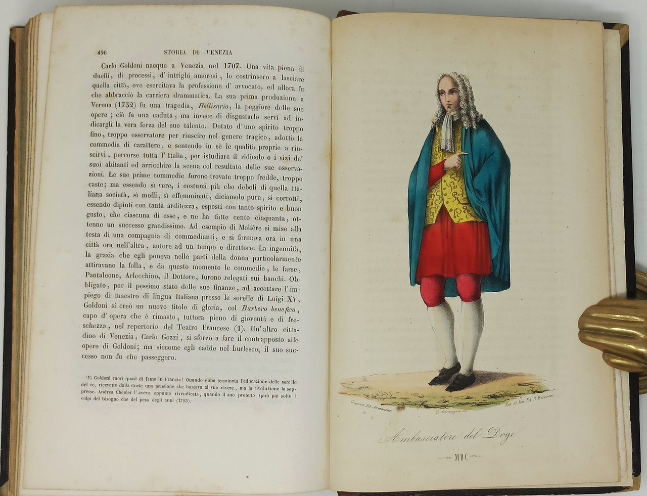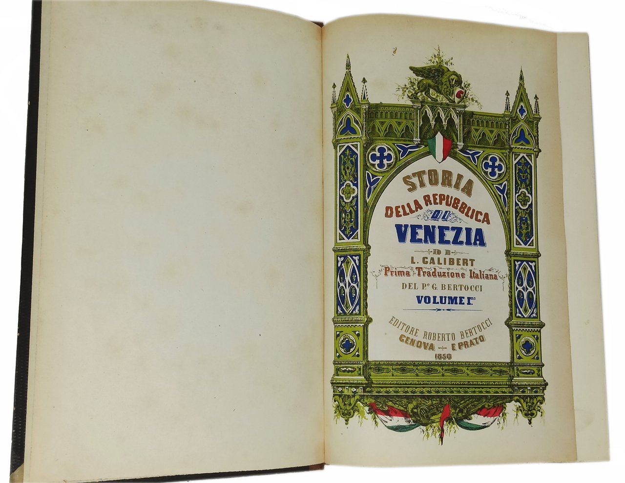 Scritta da Leone Galibert (autore dell'Algeria antica e moderna). Prato, tipografia FF. Giachetti. Anno: 1847 (sul frontespizio a colori, invece, è segnato 1850). Prima traduzione italiana del P. G. Bertocci. Dimensioni: 17,5 x 27 cm circa. 501 pagine. Stato di conservazione: qualche leggera abrasione sui margini dei piatti, tendenza dei due fogli (contenenti le pagine 67-70) a slegarsi dalla rilegatura, il foglio contenente le due pagine 239-240 si presenta stropicciato con grinze che, comunque, non pregiudicano la lettura del testo (credo una stropicciatura di natura editoriale), qualche macchiolina e ingiallimento della carta ma, nel complesso, un esemplare davvero buono. Doppio frontespizio, uno dei quali in policromo. Con 21 bellissime tavole fuori testo (tavole, riproducesti i costumi tipici di Venezia del tempo, dipinte a mano, e altre (più rare) in bianco e nero raffiguranti i luoghi più caratteristici di Venezia). IN VENDITA ESCLUSIVAMENTE IL VOLUME PRIMO (l'opera è costituita in totale da due volumi). Opera di grande pregio e di non facile reperimento. Prima edizione.