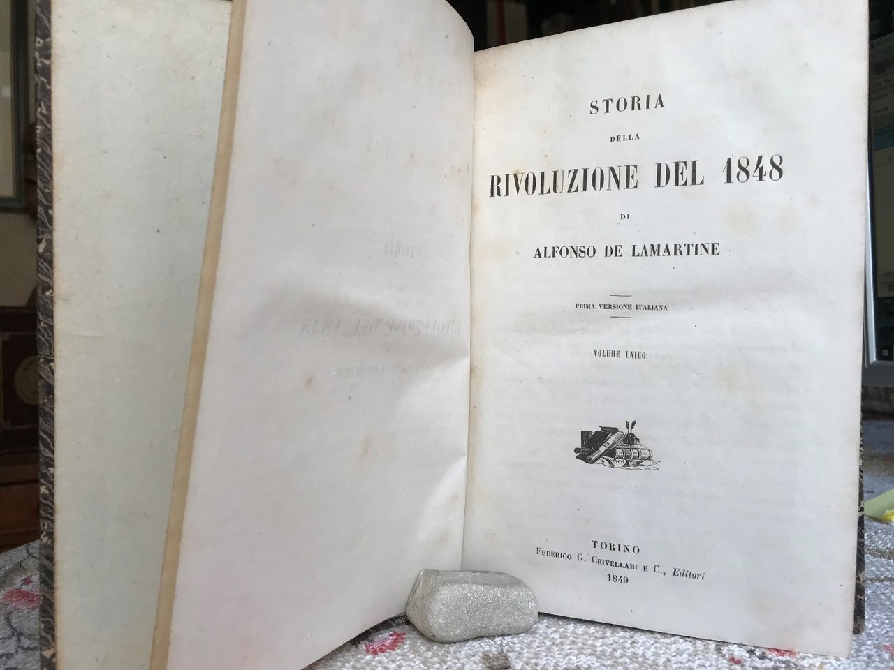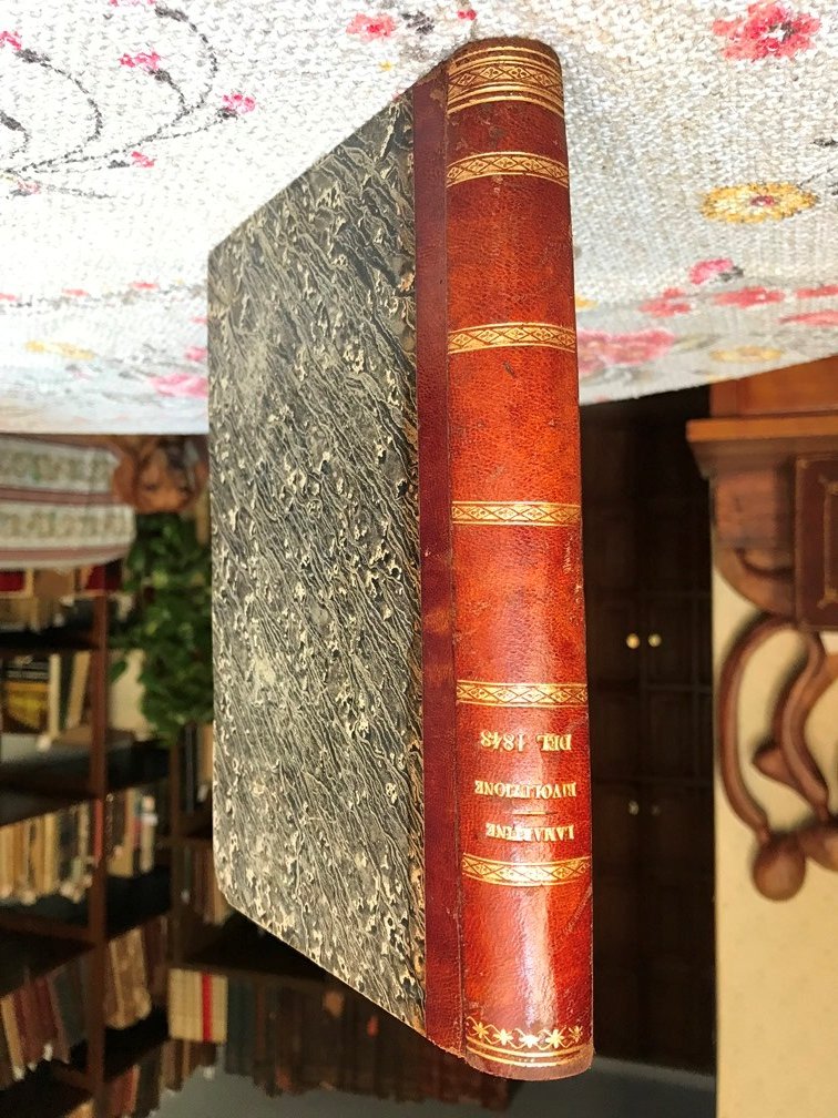 Volume in 8 grande (rubricato in 4), bella legatura coeva in mezza pelle, titolo e fregi in oro al dorso, tagli spruzzati d'azzurro, sguardie, occhiello, frontespizio, prefazione, VI, 462 pp., 1 carta n.n. contenente un documento in Nota. Approfondito studio sulle giornate di insurrezione francese che portarono all'abdicazione del re ed agli scrutigni popolari che nominarono il governo provvisorio; i giornali ed i loro collaboratori, la fuga della duchessa d'Orleans e di molti nobili e reali, Lagrange, Luis Blance ed Albert, analisi delle sette socialiste e reppublicane, la proposta di Lamartine di abolizione della pena di morte, voto unanime della stessa e proclamazione solenne della Repubblica sulla piazza della Basitiglia. Lamartine ministro degli affari esteri ed il suo lavoro diplomatico, la crisi finanziaria, le elezioni del 25 aprile ed il fermento che port contemporaneamente alla rivoluzione di Vienna, all'insurrezzione di Berlino ed ai sollevamenti della Lombardia e della Sicilia; Carlo Alberto proclama la guerra dell'indipendenza Italiana, l'abdicazione del governo provvisorio ed i suoi rapporti con gli atti della rivoluzione sino all'arresto dei capi rivoluzionari, alle dimissioni di Caussidire, la capitolazione dei Montagnards ed infine alle giornate di giugno. In bello stato. Interessante e rara prima edizione italiana.
