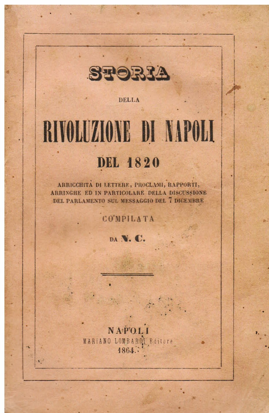 In-16°, pp. 312, brossura editoriale rosa con titolo entro duplice filetto. Una firma ottocentesca. Minime fioriture. Buon esemplare in barbe. Prima edizione, impressa con le sole iniziali dell'autore, 'N. C.', ossia Nicola Connò. L'identità dell'autore la si ricava dalla prefazione in cui l'autore chiede la compassione dei lettori per essere passato dal romanzo storico (Davide Rizio, Andrea d'Ungheria) ad un'opera di storia come quella appunto della Rivoluzione napoletana del 1820. ICCU è pertanto in errore attribuendo la paternità dell'opera a Nicola Comerci ed a Nicola Corcia. L'opera è corredata di numerosi documenti inediti.