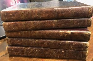 .DELLA STORIA DI FRANCIA".5 Volumi, ogni tomo ha un'antiporta inciso, al primo volume anche secondo frontespizio allegorico ( con spiegazione a lato, vedi foto). Pagg. 4, 536; 2,404; 2, 392; 2, 398; 2,426. Copertine in mezza pelle coeva. "Etichetta" ottocentesca a ciascun frontespizio con nome vecchio proprietario. Alcune bruniture e piccoli difetti alle copertine , ma nel complesso molto ben conservati