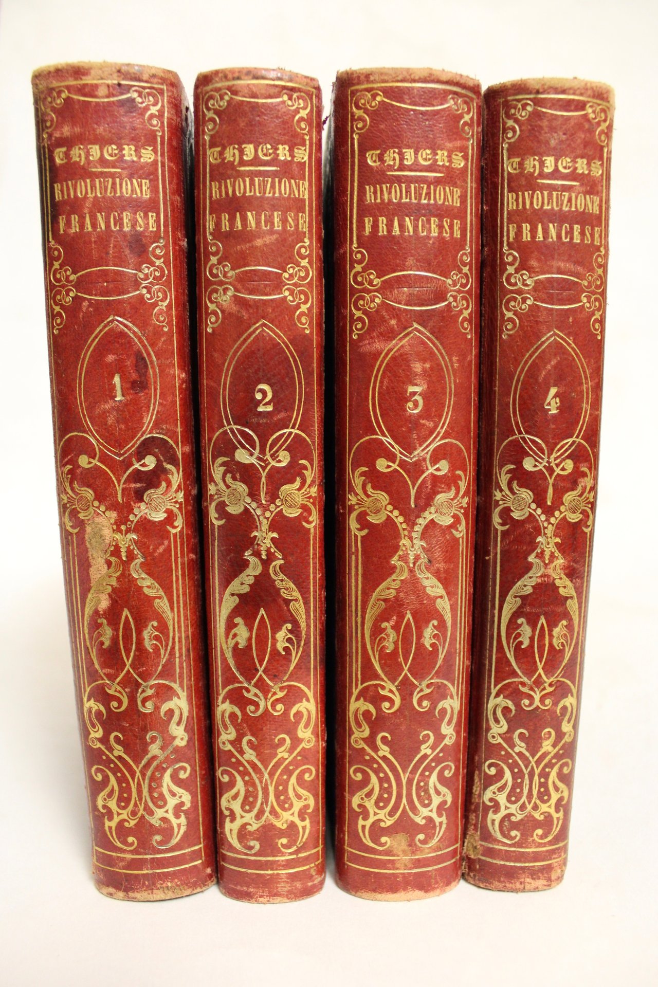 Quattro volumi in 8° (mm 215x140); pagg. 532, (2) con ritratto dell'autore; 452, (2); 571, (1); 557, (3) con 50 tavole fuori testo, ognuna con due figure incise in rame. Bella legatura rossa in mezza pelle con titolo, autore e fregi romantici in oro al dorso, piatti blu con decori floreali impressi a secco. Ottimo esemplare minime fioriture della carta, spellature a spigoli e cuffie.