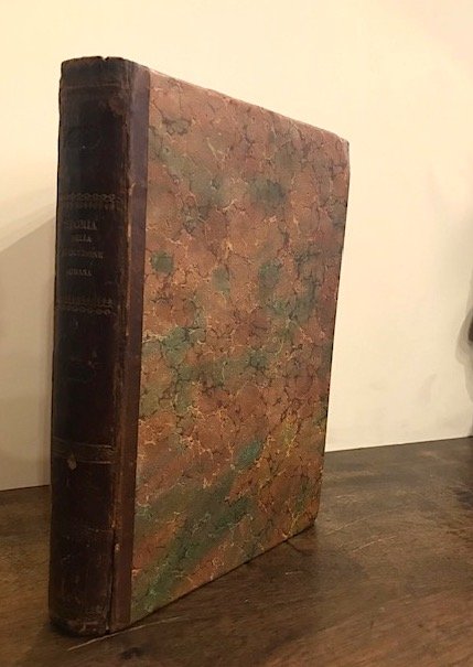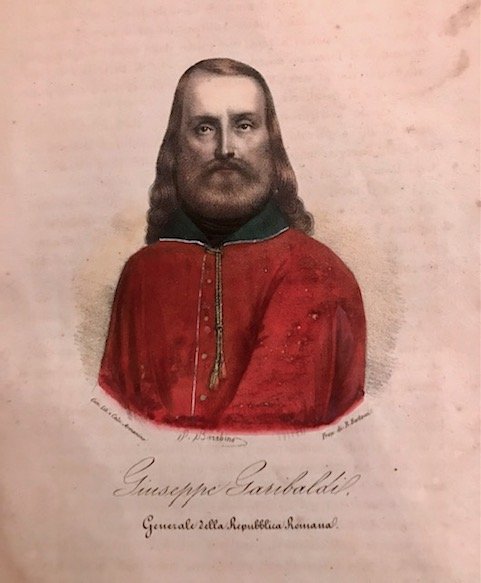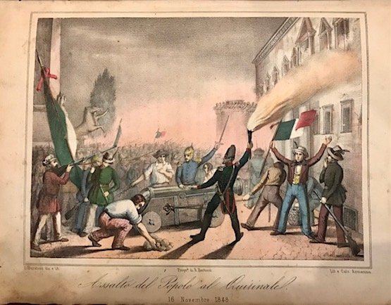 8vo (cm. 24,5), VIII-310 pp., 2 cc.nn. con 20 tavv. litografiche f.t. in coloritura d’epoca all’acquarello (segue con proprio frontespizio) La missione del diavolo scritta da un emigrato italiano, Ibidem 1850, 144 pp. con 4 (di 9) tavv. litografiche f.t. in coloritura d’epoca all’acquarello Legatura coeva in mz. pelle con fregi e titolo impressi in oro al ds. (lievi abrasioni e fenditure alle cerniere). Macchioline e ingialliture sparse e segni d’uso. Nel complesso buon esemplare. Le belle tavole di stampo popolaresco raffigurano scene della Rivoluzione (Assalto del popolo al Quirinale, Proclamazione della Repubblica, Entrata dei francesi in Roma, ecc.), battaglie (Palestrina, Velletri, Attacco al Casino dei Quattro Venti, ecc.) e ritratti dei protagonisti (Carlo Armellini, Terenzio Mamiani, Giuseppe Mazzini, Giuseppe Garibaldi, ecc.). Non comune edizione di questo illustrato risorgimentale pubblicato poco dopo i tragici avvenimenti ai quali l’autore partecipò sia come giornalista che come combattente. La seconda rara ed anonima opera (’La missione del diavolo.’) - a carattere romanzesco - ipotizza un’alleanza tra il diavolo, il pontefice e i sovrani a danno dei moti rivoluzionari.