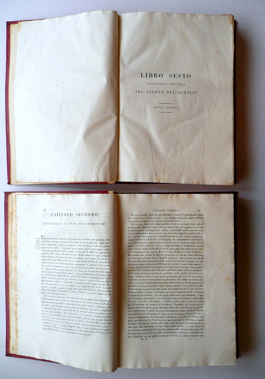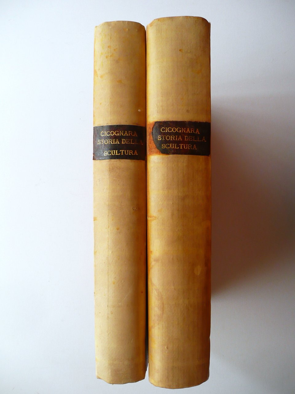 Leopoldo Cicognara, † Storia della scultura dal suo risorgimento in Italia sino al secolo XIX per servire di continuazione alle opere di Winckelmann e di D'Agincourt volume secondo - volume terzo Nella Tipografia Picotti, Venezia 1816-18; cm 42,5x31; pp. 460 pi˘ 90 bellissime tavole incise in b/n in fine volume (volume II); pp. 324-[64], pi˘ 48 bellissime tavole incise in b/n al termine del testo (volume III); legatura d'epoca in mezza pergamena con titolo impresso in oro entro tassello al dorso. Volume secondo e terzo. † Condizioni di conservazione Volumi entrambi ben conservati con tracce d'uso; coperte con alcuni leggeri graffietti, minime / piccole lievi abrasioni principalmente ai margini dei piatti, dorsi e tagli con piccole leggere bruniture; etichetta al dorso del volume II con una piccola mancanza che non comporta perdite al titolo. Interni buoni con alcune leggere bruniture e, a qualche pagina e tavola, poche marginali ombre di gore che non interessano il testo; angolo superiore di quasi tutte le tavole del volume III con, applicata al retro, braghetta cartacea per rinforzo oppure, alle tavole XXXV-XLVIII, per restauro di piccola mancanza che non interessa l'incisione (vedi foto); tavv. XLVI-XLVIII con qualche lieve gora maggiormente diffusa. † Volumi secondo e terzo, con rispettivamente 90 e 48 bellissime tavole incise in bianco e nero; il volume III dedica ampio spazio al Canova, e riserva alle sue sculture le tavole XXIII-XLVI. Rara prima edizione di 500 esemplari, di alta qualit‡ grafica ed editoriale. Mancanza del volume 1. † SETT3.L19180 N
