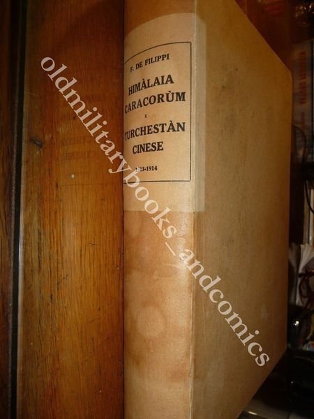 TITOLO: STORIA DELLA SPEDIZIONE SCIENTIFICA ITALIANA NEL HIMÀLAIA, CARACORÙM E TURCHESTÀN CINESE: 1913 – 1914. CON CAPITOLI AGGIUNTIVI DI GIOTTO DAINELLI E J. A. SPRANGER. DESCRIZIONE: Nicola Zanichelli Bologna 1924 I^ Ed., bella rilegatura d'epoca con titolo applicato al dorso, pp. ?XIII+541, centinaia di foto in b.n. nel t.; 31 tavv. f.t. di cui: 12 panorami ripieg., 2 tavv. a colori (1 applic. su cartoncino); al fine - contenuti in una cartella - 7 panorami e 1 veduta in 4 tavv. più volte ripieg. + 3 carte geografiche a colori (più volte ripieg.) + 4 schizzi idrografici / topografici n.t. Resoconto della spedizione, dallagosto 1913 al dicembre 1914, attraverso l'India, il Baltistan, il Ladak, l'Asia Centrale e il Turchestan russo. in 4°. Alcune tavole non rispettano la numerazione dell’indice, l’illustrazione di pg. 352 ha un titolo differente rispetto a quella dell’indice e ragionevolemente la tav. a pg. 350 risulta assente. Prima edizione (l'opera fu ristampata in 3 voll. nel 1979-81). Il volume fu anche tradotto in inglese e pubblicato a Londra, da Arnold, nel 1932. Enrico De Filippi (Torino, 1869 - Settignano, Firenze, 1938), medico-chirurgo, figlio dell'avv.to Giuseppe e di Olimpia Sella, grande appassionato di montagna, nel 1897 aveva accompagnato il Duca degli Abruzzi al Monte Sant'Elia in Alaska, nel 1903 aveva percorso il Caucaso e il Turkestan e nel 1909, ancora col duca degli Abruzzi, il Karakorum. Grazie alla vasta esperienza acquisita, concepì poi l'ambizioso progetto di organizzare una spedizione scientifica italiana nella catena dell'Himalaya occidentale e del Karakorum. Questa spedizione, finanziata dal governo italiano, da mecenati e da numerose società scientifiche, partì nell'agosto 1913 dall'Italia percorrendo oltre 2.000 km. nel Kashmir e nel Turkestan russo, per rientrare in Italia nel dicembre 1914. Essa era composta da un corpo di specialisti italiani, con il concorso del Maggiore Wood e del Servizio Geodetico Indiano. "Gli imponenti ed eccezionali risultati scientifici raggiunti furono elaborati dai diversi partecipanti dopo la prima guerra mondiale e raccolti in un'opera di più di seimila pagine, divisa in due parti, la prima di tre volumi contenente le relazioni di geodesia e geofisica, la seconda, di dodici volumi, affidata alla direzione scientifica ed editoriale di G. Dainelli, con gli studi di argomento geologico e geografico" Risultati di questa spedizione furono inoltre la delimitazione completa dell'ultimo grande sistema di ghiacciai del Karakorum e la scoperta delle sorgenti del fiume Jarcand in una lingua del ghiacciaio Rimo, che svallona a Nord, oltre lo spartiacque. Indice completo in foto. CONDIZIONI: Buone/Ottime, tutte la carte presenti ad eccezione dell'errore precedentemente citato. PESO / WEIGHT: 2403 gr. without package