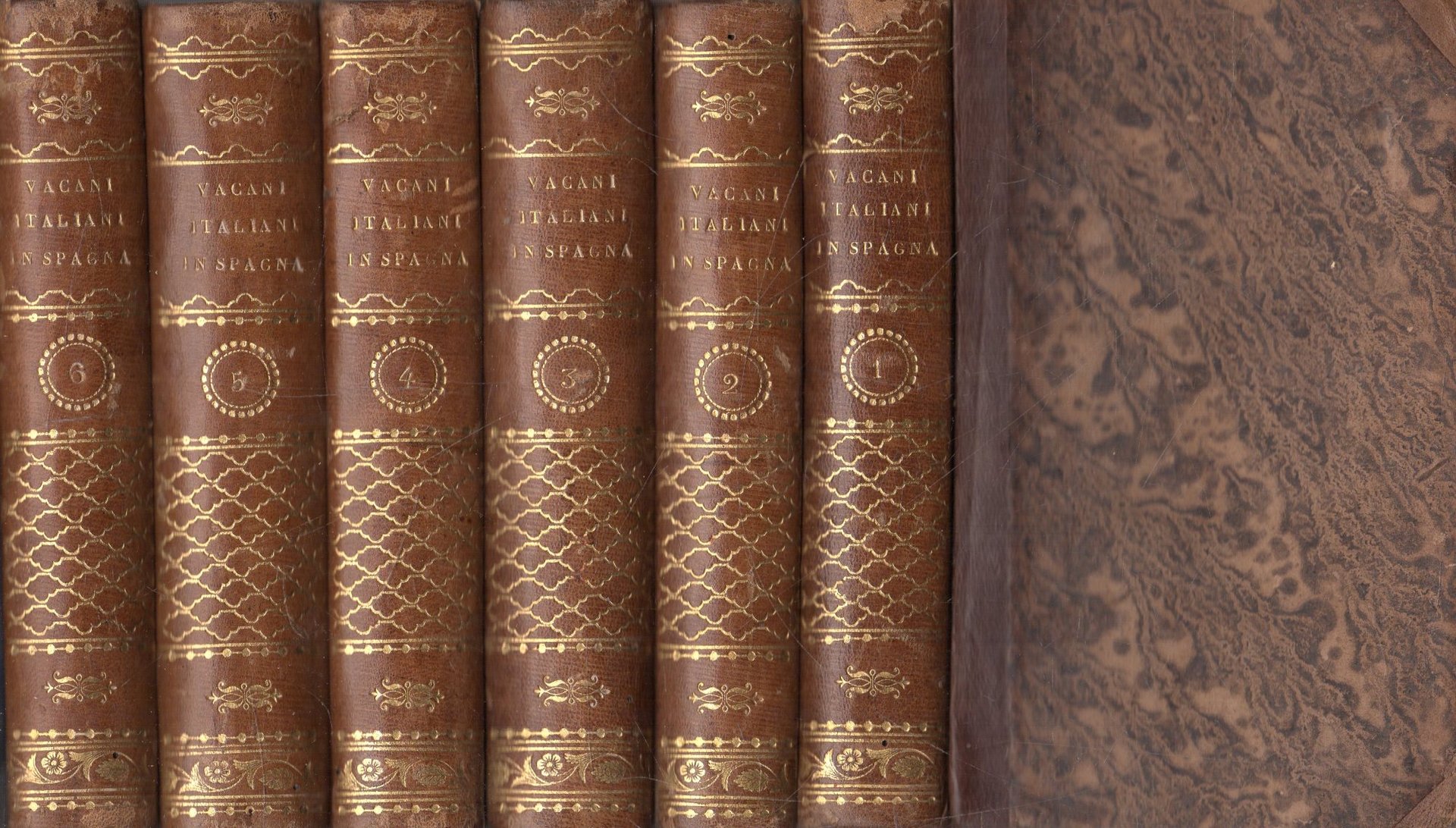 1808 - 1813. Mezza legatura in pelle con titoli e fregi in bassorilievo in oro, al piatto cartonato marmorizzato. 6 vol..