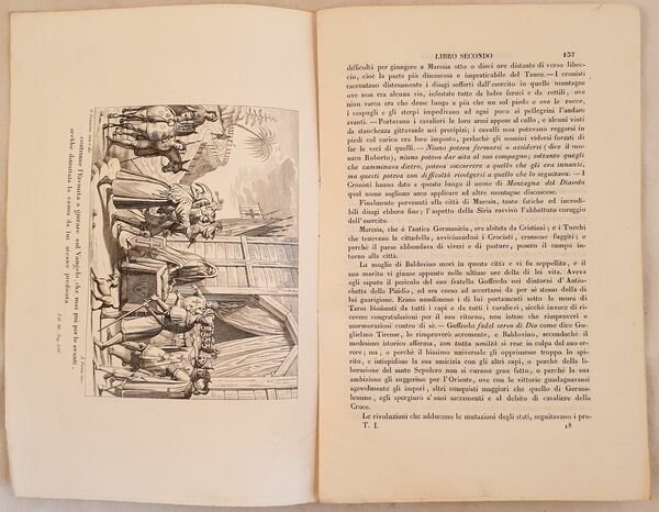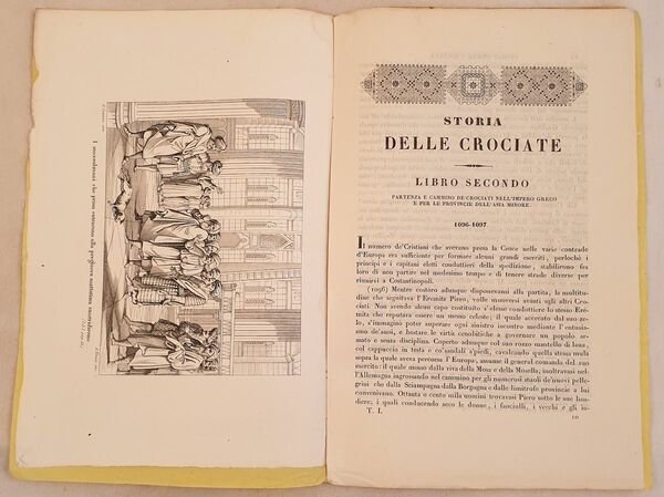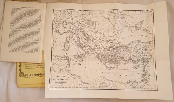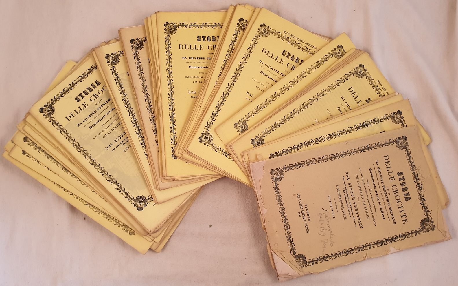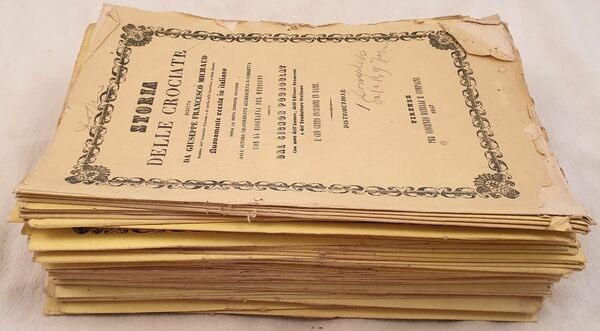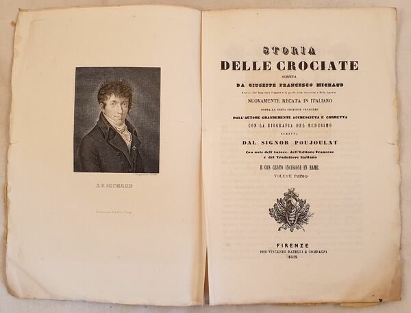 Bella edizione illustrata del 1842 della storia delle crociate scritto da Giuseppe Francesco Michaud. Biografia di Michaud scritta da Poujoulat. L'opera era composta da due volumi siamo purtroppo in possesso del primo tomo solamente. L'opera è in barbe e intatta, ancora all'interno delle dispense originali. Il testo è impreziosito da 67 incisioni fuori testo incise da Campantico e Verico. E’ inoltre presente una mappa ripiegata che mostra l’itinerario delle crociate. In ottime condizioni. Copertina editoriale in ottime condizioni generali con lievi usure ai margini e dorso. Legatura quasi assente. All'interno le pagine si presentano in ottime condizioni con rare fioriture. Gore d'umidtà al margine superiore della distribuzione 19 (pp. dalla 145 alla 152). In 4. Dim. 27,5x18 cm. Pp. 740. Beautiful illustrated edition of 1842 of the history of crusades written by Giuseppe Francesco Michaud. Biography by Michaud written by Poujoulat. The workw as made up of two tomes unfortunately we only have the first tome. The work is uncut, still inside the original instalments. the etxt is enriched by 67 out of text prints by Campantico and Verico. In very good conditions Editorial cover in very good general conditions slightly worn in the edges and spine. Binding is almost missing. Inside pages are in very good conditions with occasional foxings. Water stains in the upper edge of instalment 19 (pp. from 145 to 152). In 4. Dim. 27,5x18 cm. Pp. 740.