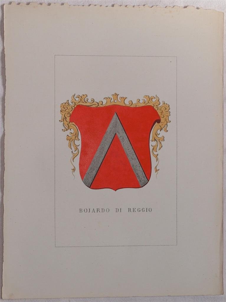 In 4. Dim. 32x14 cm. Pp. (5). Edizione del 1872 di questa interessante storia genealogica delle famiglie illustri italiane. L'opera, pubblicata a dispense in quattro volumi, riportava la storia di ogni famiglia presente nella raccolta e relativo stemma nobiliare splendidamente acquarellato a mano. Proponiamo il fascicolo sulla Famiglia Bojardo di Reggio Emilia. Il testo è di quattro pagine. Bellissimo stemma a piena pagina acquarellato coevo. In buone condizioni. Copertina assente. Legatura assente. Pagine in ottime condizioni con rare fioriture, margini con usure non rifilati. Macchia di altro stemma nel testo. Edition of 1872 of this interesting genealogical history of noble italian families. The work, published in instalments in four volumes, described the history of each family in the collection and relative coat of arms coloured with acquarello by hand. We propose the pamphlet about Family Bojardo from Reggio Emilia. The text is made up of four pages. Very beautiful coat of arms coeval painted with acquarello by hand. In good conditions. Cover is missing . Binding is missing. Inside pages are in very good conditions with occasional foxings, edges are uncut with wearings. Stain of another coat of arm in the text.