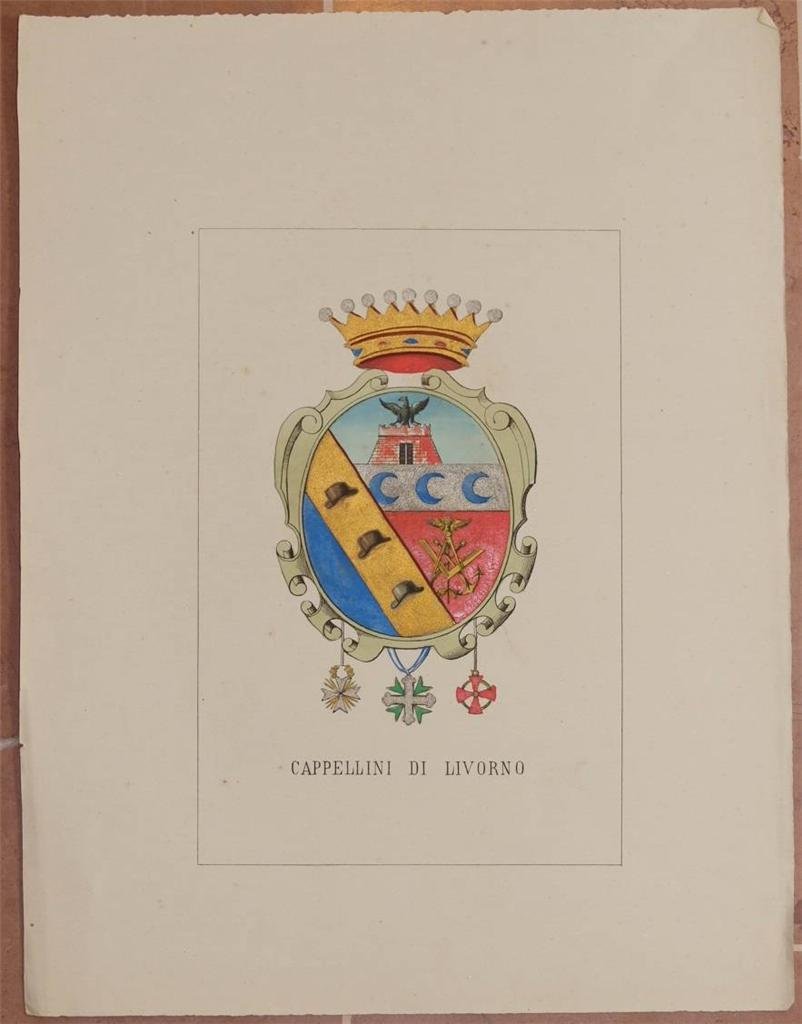 In 4. Dim. 32x24,5 cm. Pp. (1). Edizione del 1872 di questa interessante storia genealogica delle famiglie illustri italiane. L'opera, pubblicata a dispense in quattro volumi, riportava la storia di ogni famiglia presente nella raccolta e relativo stemma nobiliare splendidamente acquarellato a mano. Proponiamo lo stemma della Famiglia Cappellini di Livorno. Il testo è mancante. Bellissimo stemma a piena pagina acquarellato coevo. In buone condizioni. Copertina assente. Legatura assente. Pagine in ottime condizioni con rare fioriture, margini con usure non rifilati. Edition of 1872 of this interesting genealogical history of noble italian families. The work, published in instalments in four volumes, described the history of each family in the collection and relative coat of arms coloured with acquarello by hand. We propose the coat of arms of the Family Cappellini from Livorno. The text is missing. Very beautiful coat of arms coeval painted with acquarello by hand. In good conditions. Cover is missing. Binding is missing. Inside pages are in very good conditions with occasional foxings, edges are uncut with wearings.