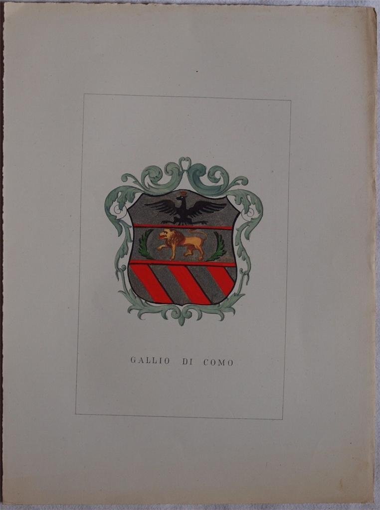 In 4. Dim. 32x14 cm. Pp. (5). Edizione del 1872 di questa interessante storia genealogica delle famiglie illustri italiane. L'opera, pubblicata a dispense in quattro volumi, riportava la storia di ogni famiglia presente nella raccolta e relativo stemma nobiliare splendidamente acquarellato a mano. Proponiamo il fascicolo sulla Famiglia Gallio di Como. Il testo scritto è di quattro pagine. Bellissimo stemma a piena pagina acquarellato coevo. In buone condizioni. Copertina assente. Legatura assente. Pagine in ottime condizioni con rare fioriture, margini con usure non rifilati. Macchia di altro stemma nel testo. Edition of 1872 of this interesting genealogical history of noble italian families. The work, published in instalments in four volumes, described the history of each family in the collection and relative coat of arms coloured with acquarello by hand. We propose the pamphlet about Family Gallio from Como. The written text is made up of four pages. Very beautiful coat of arms coeval painted with acquarello by hand. In good conditions. Cover is missing. Binding is missing. Inside pages are in very good conditions with occasional foxings, edges are uncut with wearings. Stain of another coat fo arm in the text.