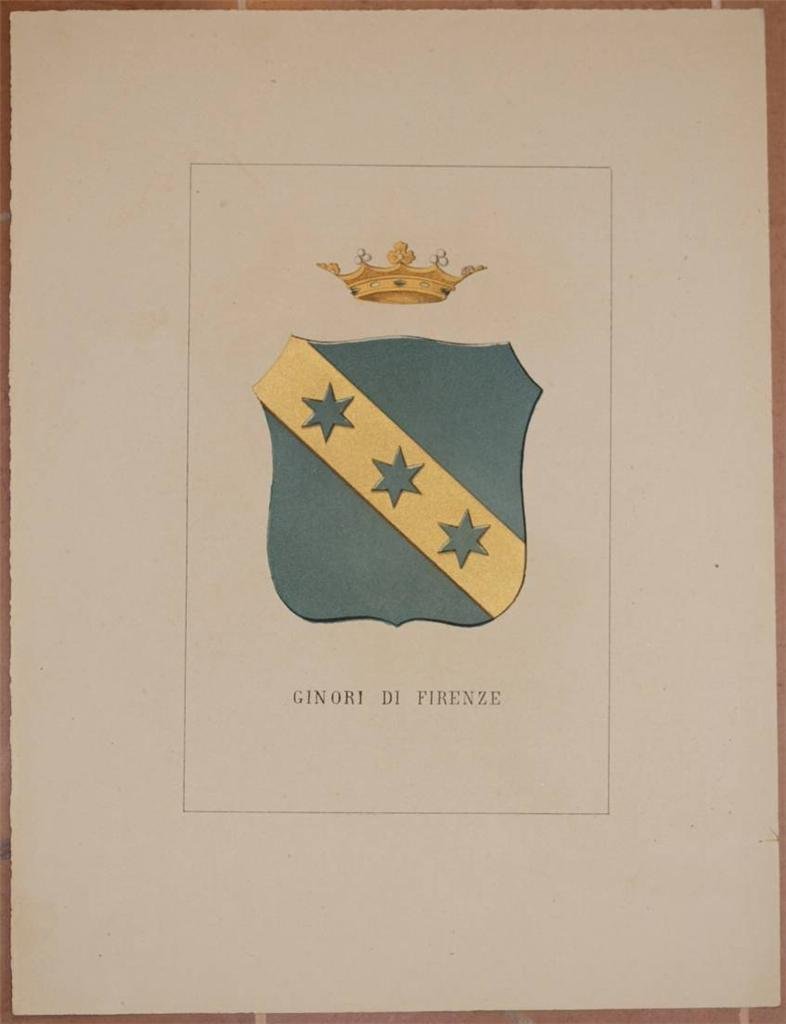 In 4. Dim. 32,5x24,5 cm. Pp. (6). Edizione del 1872 di questa interessante storia genealogica delle famiglie illustri italiane. L'opera, pubblicata a dispense in quattro volumi, riportava la storia di ogni famiglia presente nella raccolta e relativo stemma nobiliare splendidamente acquarellato a mano. Proponiamo il fascicolo sulla Famiglia Ginori di Firenze. Il testo scritto è di cinque pagine. Bellissimo stemma a piena pagina acquarellato coevo. In buone condizioni. Copertina assente. Legatura assente. Pagine in ottime condizioni con rare fioriture, margini con usure non rifilati. Macchia di altro stemma nel testo. Edition of 1872 of this interesting genealogical history of noble italian families. The work, published in instalments in four volumes, described the history of each family in the collection and relative coat of arms coloured with acquarello by hand. We propose the pamphlet about Family Ginori from Florence. The written text is made up of five pages. Very beautiful coat of arms coeval painted with acquarello by hand. In good conditions. Cover is missing. Binding is missing. Inside pages are in very good conditions with occasional foxings, edges are uncut with wearings. Stain of another coat of arm in the text.