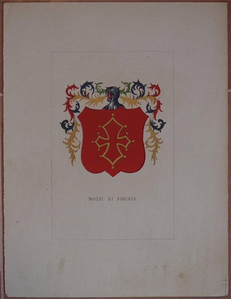 In 4. Dim. 32,5x24,5 cm. Pp. (3). Edizione del 1872 di questa interessante storia genealogica delle famiglie illustri italiane. L'opera, pubblicata a dispense in quattro volumi, riportava la storia di ogni famiglia presente nella raccolta e relativo stemma nobiliare splendidamente acquarellato a mano. Proponiamo il fascicolo sulla Famiglia Mozzi di Firenze. Il testo scritto è di due pagine. Bellissimo stemma a piena pagina acquarellato coevo. In buone condizioni. Copertina assente. Legatura assente. Pagine in ottime condizioni con rare fioriture, margini con usure non rifilati, ancora unite fra loro. Edition of 1872 of this interesting genealogical history of noble italian families. The work, published in instalments in four volumes, described the history of each family in the collection and relative coat of arms coloured with acquarello by hand. We propose the pamphlet about Family Mozzi from Florence. The written text is made up of two pages. Very beautiful coat of arms coeval painted with acquarello by hand. In good conditions. Cover is missing. Binding is missing. Inside pages are in very good conditions with occasional foxings, edges are uncut with wearings, still bound together.