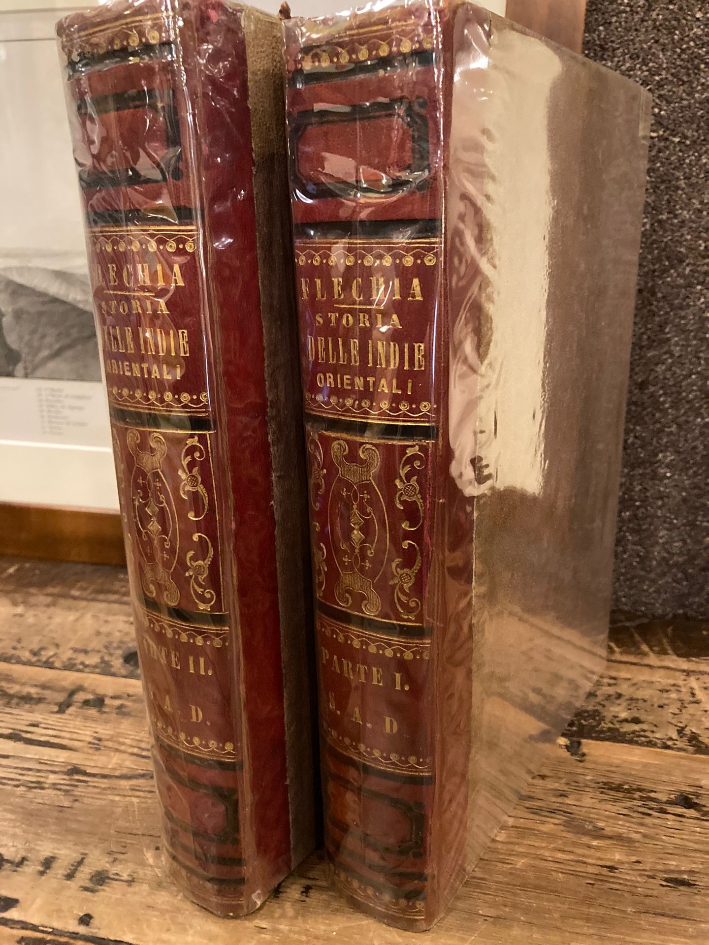 Due volumi in-4° (28x20 cm), pp. (8), 674; (4), 675-1311 (1), elegante mezza pelle rossa coeva con titoli, fregi e tomaisons dorati ai dorsi, sgaurdie marmorizzate. 47 tavole f.t. incise in litografia a tinta seppiata dal Perrin, 8 delle quali cromolitografiche (alcune con fondo oro) raffiguranti monumenti, località, divinità del Pantheon indiano, personaggi storici, etc. In fine, una bella carta generale litografica dell'India incisa da Giovanni Anico e ripiegata più volte. Alle carte bianche anteriori ex libris applicati e firme di precedente antico possessore. Pochissime pagine brunite, poche lievemente arrossate ma ottimo esemplare completo dell' affascinante apparato iconografico. Edizione originale di quest'importante e dotta monografia storica sull'India. La prima parte, compilata dal geografo Francesco Costantino Marmocchi (e pubblicata postuma) è dedicata alla geografia naturale (geologia, mineralogia, climatologia, meteorologia, fitologia, zoologia) e comparata, all'etnografia, all'antropologia; la seconda, di gran lunga la più estesa e dovuta al Flechia, è consacrata alla storia dell'India dall'età primitiva alla dominazione britannica, alla religione, alla letteratura e alle arti. Il Flechia (Piverone, Ivrea, 1811-ivi, 1892), professore di sanscrito a Torino, Senatore dal 1891, fu uno dei maggiori esponenti del grande fermento di studi orientalistici dell'Ottocento italiano. Autore della prima grammatica sanscrita italiana, si dedicò alla linguistica comparata - sia in relazione alle lingue romanze che a quelle orientali - sotto l'influsso dell'Ascoli, lasciando geniali studi di dialettologia (fornì la prima descrizione scientifica del genovese antico), onomastica, toponomastica, etimologia. Il Marmocchi (Poggibonsi, 1805-Ginevra, 1858) fu noto geografo e cartografo. In rapporti con Mazzini, fu coinvolto nei moti politici del 1831 e subì dure persecuzioni che si spinsero sino alla prigionia da parte del governo granducale. Eletto nel 1848 deputato al Parlamento toscano, fu nominato con decreto granducale Segretario del Ministero dell'Interno allora retto dal Guerrazzi. Emigrato poi a Roma, e ancora dopo in Corsica, che perlustrò a lungo con il Gregorovius, si fissò successivamente a Torino e, infine, a Genova, dove rimase per il resto della vita attendendo soprattutto a compilazioni geografiche. Manca al Fossati Bellani.
