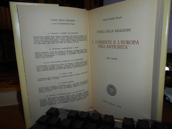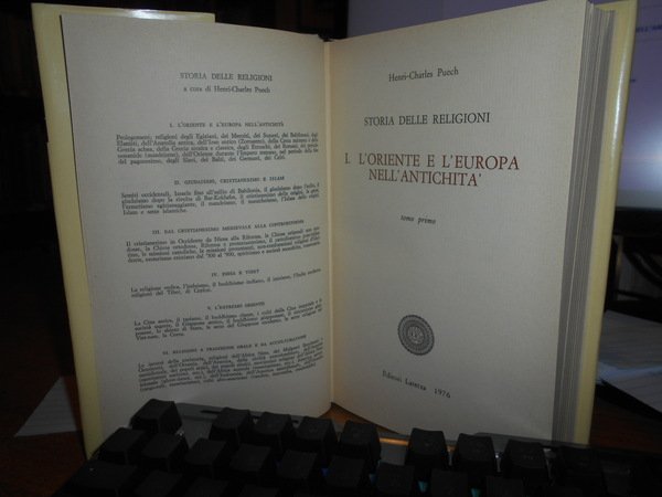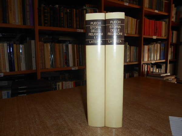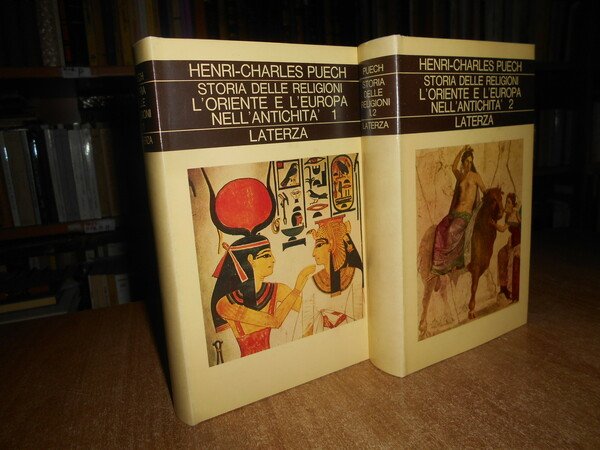 HENRI-CHARLES PUECH. Bari, Gius. Laterza & Figli, 1976. Storia delle Religioni l' Oriente e l' Europa nell' Antichità. 2 volumi in-8° piccolo, cartonato edit. con titoli ai dorsi e sovracopertine. Complessive 958, (3) pp. paginazione continua. In ottimo stato di conservazione. Uff. stanzetta
