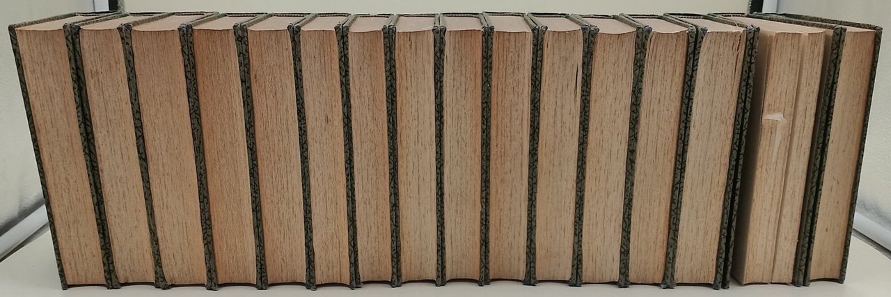 16 tomi in 16', mz. tela con tit. in oro al dorso,; fioriture diffuse su tutti i volumi, legature salde e in buono stato, tranne piccolo strappo alla costa del II tomo.