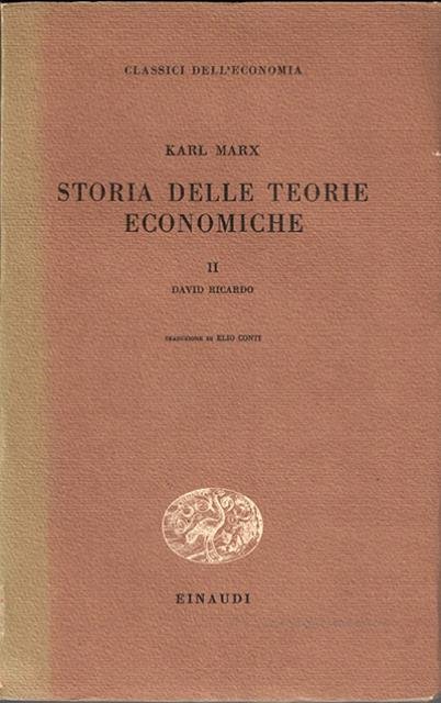 XXVIII, 399 p. ; 22 x 14 cm. Classici dell'economia, 1.2. Titolo originale dell'opera: «Theorien über den Mehrwert. Aus dem nachgelassenen Manuskript "Zur Kritik der politischen Ökonomie". 1. David Ricardo». Traduzione di Elio Conti. Brossura editoriale, coperta in cartoncino flessibile di colore marrone. Titolo impresso in nero al piatto e al dorso, libro intonso. Codice libreria 9661.