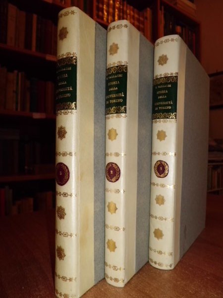 VALLAURI, Tommaso. Torino, Stamperia Reale, 1845 - 1846. 3 volumi in - 8°, m. pergamena con titolo e decorazioni in oro nei dorsi, copertine originali conservate. xvi, 382, (2) pp.; 296, (2) pp.; 348, (4) pp. Esemplare intonso a fogli chiusi. Lievi usuali rifioriture dovute alla qualità della carta. Opera importante. L' autore fu Professore di eloquenza latina nell' Università di Torino e membro della Deputazione sopra gli studi di storia patria. Uff. Mob. 2
