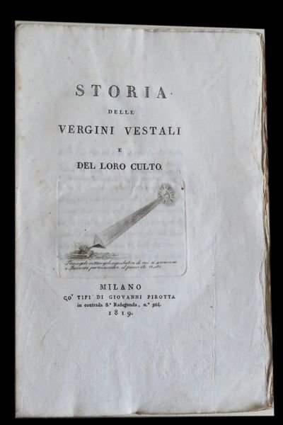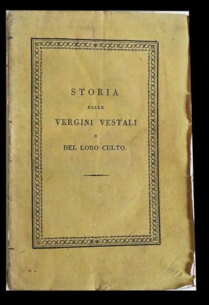 In 8° (22×14,5 cm); (2), XVI, (6), 152 pp. Bella brossura editoriale gialla con titolo entro cornice xilografica al piatto anteriore, cornice che si ritrova anche al piatto posteriore. Titolo e fregi in nero al dorso. Piccola mancanza dellangolo inferiore bianco delle ultime 10 carte, lontano dal testo e per il resto esemplare ancora in barbe, con ampi margini e in parte ancora intonso. Bellincisione al frontespizio. Prima edizione, che ebbe notevole successo, tanto che una seconda edizione uscì già nel 1822, di questa monografia di A. G. Frigerio dedicato alle Vergini Vestali. Le vestali erano sacerdotesse consacrate alla dea Vesta. A Romolo, primo re di Roma, o al suo successore, Numa Pompilio, è attribuita listituzione del culto del fuoco, con la creazione delle vergini sacre a sua custodia, chiamate Vestali. Il loro compito era di mantenere sempre acceso il fuoco sacro alla Dea, che rappresentava la vita della città, e compierne il culto a nome, appunto, della città. Erano inoltre incaricate di preparare gli ingredienti per qualsiasi sacrificio pubblico o privato, come la mola salsa, farina tostata mista a sale, con cui si cospargeva la vittima (da qui il termine immolare). In principio le vestali erano tre (o quattro) fanciulle vergini, in seguito il loro numero fu portato a sei fanciulle che erano sorteggiate allinterno di un gruppo di 20 bambine di età compresa fra i 6 e i 10 anni appartenenti a famiglie patrizie. La consacrazione al culto, officiata dal Pontefice massimo avveniva tramite il rito della captio e il servizio aveva una durata di 30 anni: nei primi dieci erano considerate novizie, nel secondo decennio erano addette al culto mentre gli ultimi dieci anni erano dedicati allistruzione delle novizie. In seguito erano libere di abbandonare il servizio e sposarsi. Vesta, figlia di Saturno e di Opi, sorella di Giove, è una figura della mitologia romana, che corrisponde alla divinità greca Estia, con la differenza che il suo culto a Roma assunse una maggiore rilevanza. Vesta è la dea del Focolare domestico. Prima edizione in buone condizioni di conservazione di questo importante studio delle tradizioni dellantica Roma. Non comune.