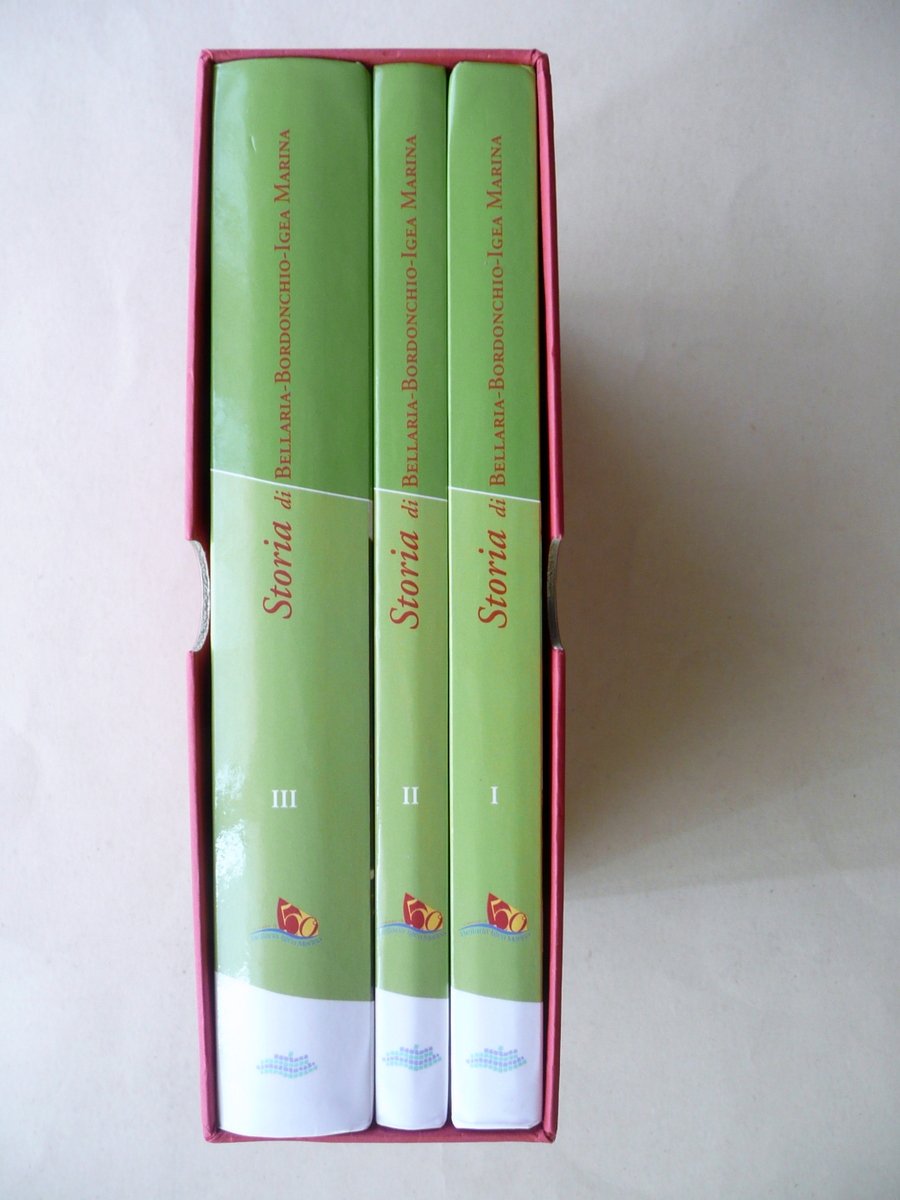 AA. VV., Storia di Bellaria - Bordonchio - Igea Marina Ricerche e studi sugli abitanti e sul territorio Volume I: dalle origini al XIII secolo Volume II: 1200 - 1500 Volume III: 1500 - 1970 BCC (Banca Credito Cooperativo) - Romagna Est, 2004-2009, cm 24,5x17,5, pp. 230 (volume I); pp. 164 (volume II); pp. 502 (volume III), tutti con numerose ill. in b/n nel t. e fuori t. (il volume III presenta qualche ill. a colori); al termine del volume I è presente una grande carta in b/n rip. più volte (vedi foto). Tutto cartonato ed. ill. a colori. Opera completa in tre volumi contenuti entro cofanetto ed.in cartonato muto. Condizioni di conservazione Volumi tutti e tre in ottime condizioni con minime tracce di utilizzo. Interni ottimi. Dettagliatissima pubblicazione di carattere storico su Bellaria - Bordonchio - Igea Marina, corredata da un ricco apparato iconografico. Opera completa in tre volumi. Ottimo stato di conservazione. SETT114.L10929 N