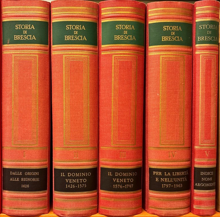 Storia di Brescia. Cinque volumi. Promossa e diretta da Giovanni Treccani degli Alfieri. Vol.I: Dalle origini alla caduta della signoria Viscontea (1426). Vol. II: La dominazione veneta (1426-1575). Vol. III: La dominazione veneta (1576-1797). Vol. IV: Dalla Repubblica Bresciana ai giorni nostri. Vol. V: Indici.