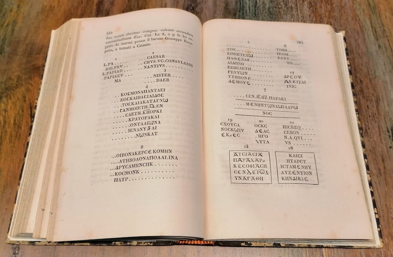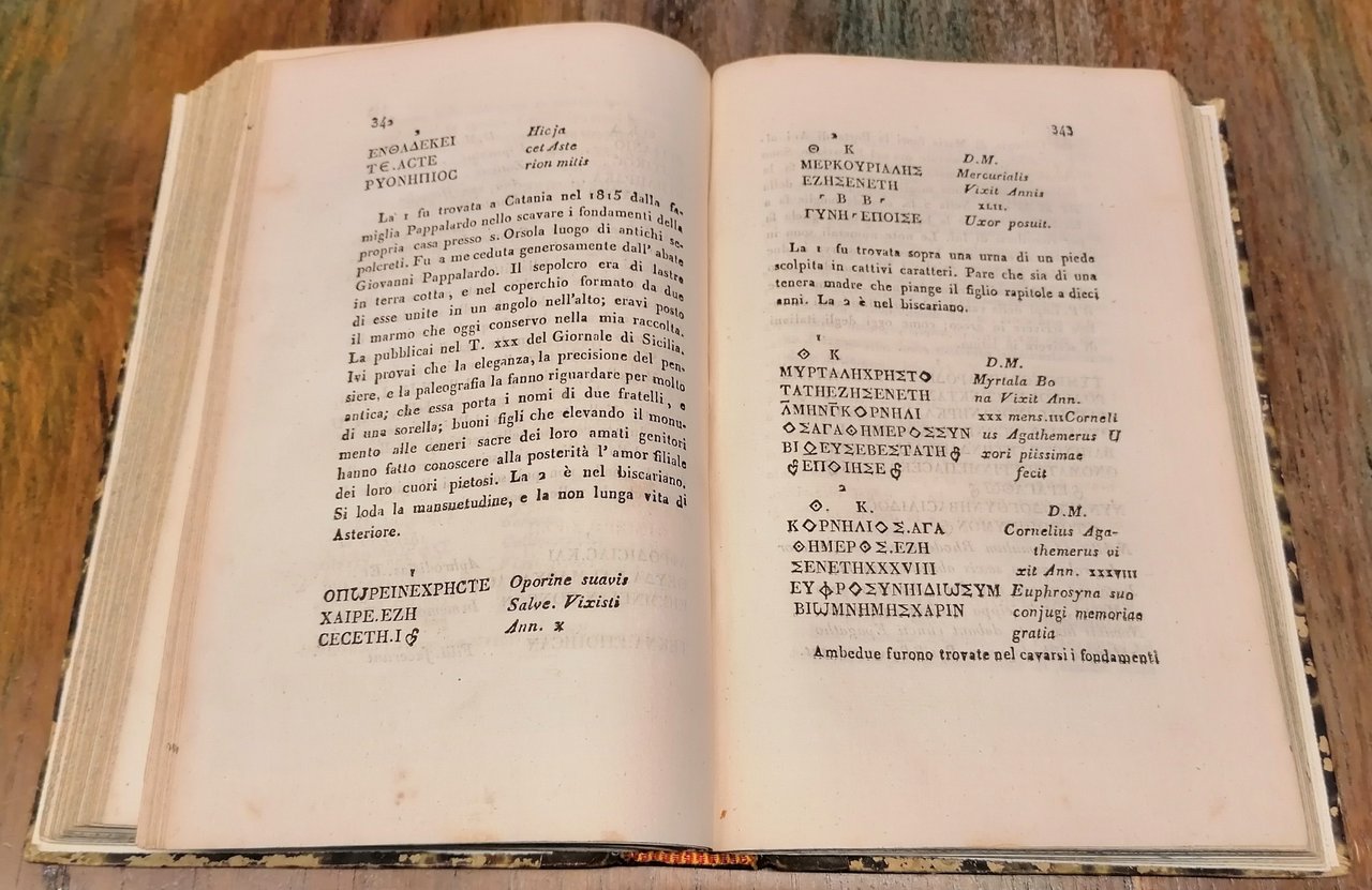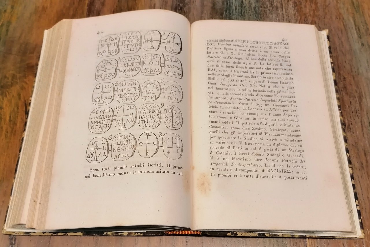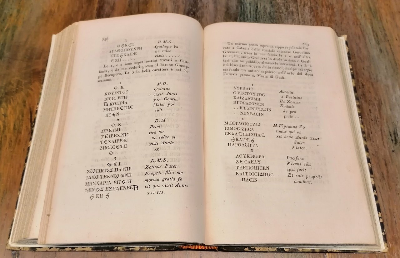Catania, Tipi di Lorenzo Dato, 1829. Edizione originale. In 8°, legatura coeva in mezza pelle con titoli e ricche impressioni in oro al dorso, carta marmorizzata ai piatti, tagli spruzzati, pp. VIII,573,(3). Una vecchia firma al frontespizio. Ottimo stato di conservazione.