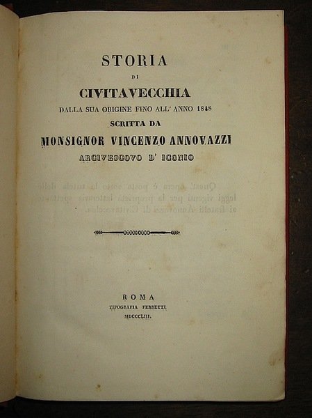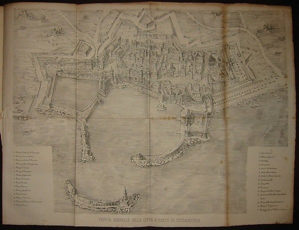 4to (cm. 27,3), XXVIII, 488, CXXII pp., 1 c.nn. con cinque tavole f.t. (di cui tre grandi litografie più volte ripiegate, compresa la ’Veduta generale della città e porto di Civitavecchia’). Legatura coeva in piena tela con fili e titolo oro al dorso. Sporadiche, lievi fioriture, ma ottimo esemplare. Opera importante e rara. Lozzi I, n. 1268.