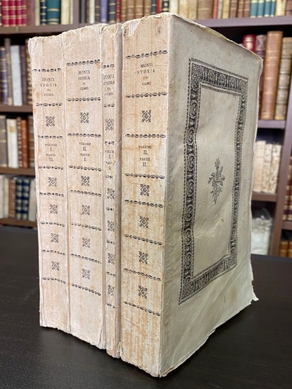 <span style="font-style: normal;">2 volumi in 4 tomi in-8° (cm. 23,7), brossure editoriali con titolo e fregi a stampa al dorso ed elementi decorativi inquadrati da cornici sempre a stampa ai piatti (tracce d'usura); pp. XXVI 27-181 [3], [3] 188-565 [3]; 457 [3]; 452 [4] 460-894 [2] con le solite fioriture di questa impressione, anche forti. Prima edizione della classica storia del Monti, «viaggiatore instancabile e ricercatore insonne», che studiò l'intera storiografia precedente e visitò personalmente tutto il vasto agro comasco. «L'opera, e particolarmente le note critico-erudite ad ogni singolo libro, rivelano le preoccupazioni umanistico-classiche dell'autore, e documentano il suo vivo amore per Como». [G. Miglio, </span><i>Il mito del Lario</i>, in <i>Larius</i>, II, XXXVIII]. Dedicata a Francesco Rezzonico podestà cittadino, manca a Predari, Platneriana e Lozzi. Esemplare più che discreto. (SJ2-2c)