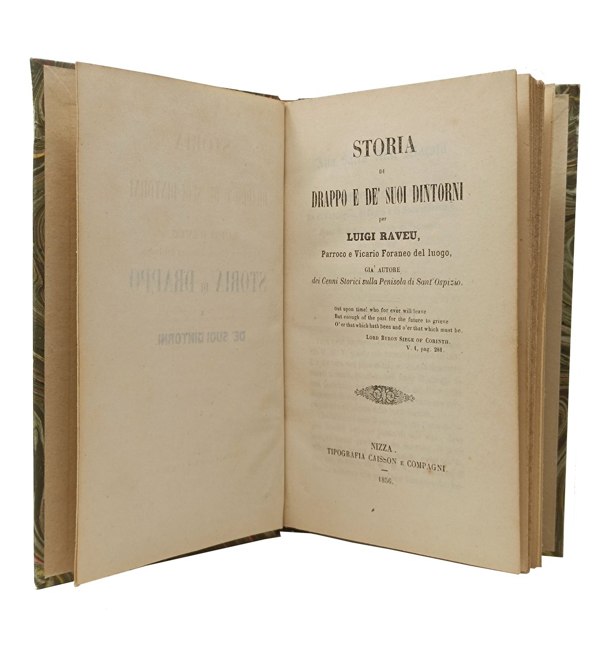 autore: Luigi Raveu, parroco e Vicario Foraneo del luogo, già autore dei 'Cenni Storici sulla Penisola di Sant'Ospizio'. Nizza, Tipografia Caisson e Compagni. Anno: 1856. Lingua del testo: italiano. Formato: 11 x 17,5 cm circa. Pagine: 128. Stato di conservazione: qualche piccola macchiolina gialla della carta ma, nel complesso un esemplare decisamente buono. privo di timbri, firme d'appartenenza o altri segni nel testo. Copertina non editoriale, cartonata rigida con tassello con titolo in oro applicato sul dorso. Drappo (Drap) è un comune francese, a sette km da Nizza appartenente al Regno di Sardegna-Piemonte e poi annesso (insieme a tutta la contea di Nizza) alla Francia. Opera rara.