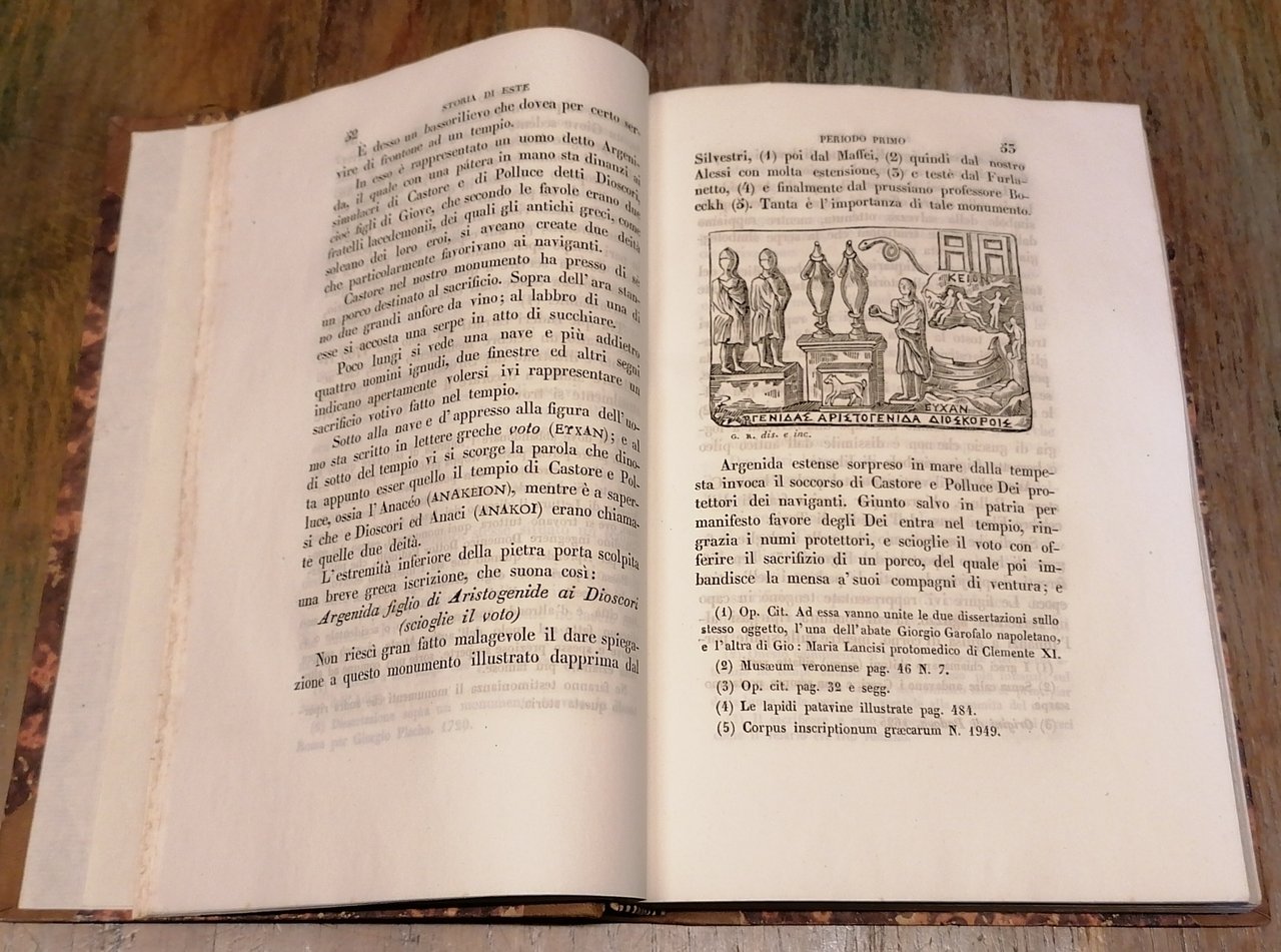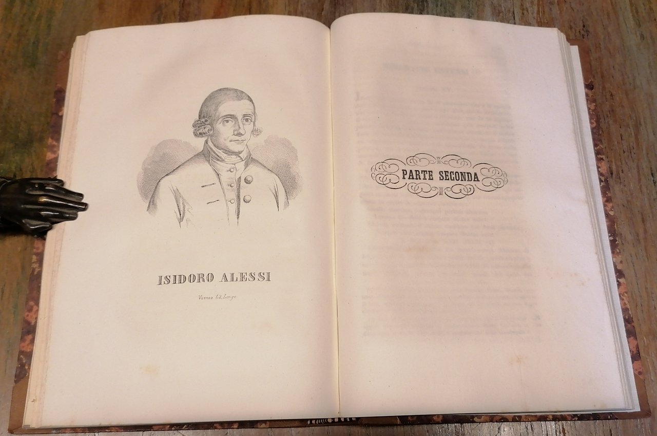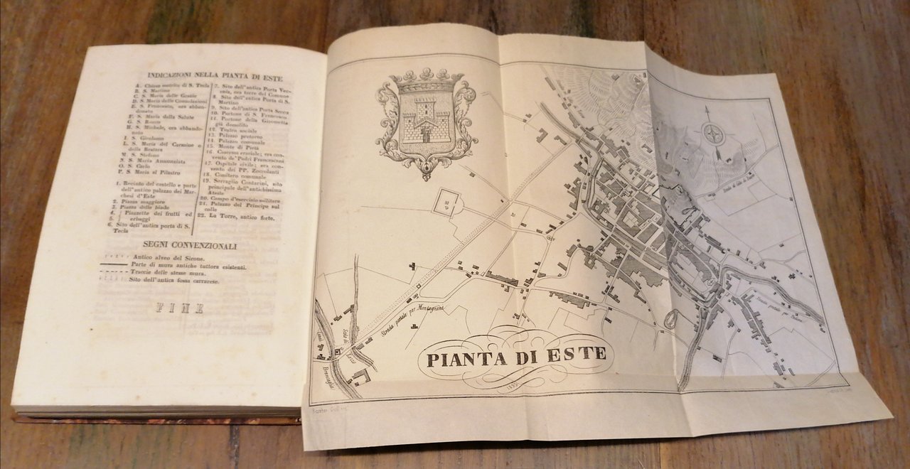 (Veneto - Este - Ateste - Colli Euganei) In 8°, legatura coeva in mezza pelle marrone, al dorso titoli e filetti ornati impressi in oro, fregi a secco, carta marmorizzata ai piatti, pp. 656,(4), con 9 incisioni xilografiche nel testo, due tavole litografiche fuori testo con i ritratti di Isidoro Alessi e Antonio Zanchi, una tavola litografica ripiegata con la Pianta della città di Este in fine. Ad una prima parte storica che si chiude con il carme "Este" del Dott. Domenico Coletti, fa seguito una seconda che contiene : "Biografie estensi", "Chiese e monasteri", "Fabbricati, stabilimenti d'istruzione e beneficenza, feste e villeggiature", "Territorio estense", "Schizzo sulla geologia, idrografia, agricoltura, industria e commercio nel territorio atestino". Edizione originale. Ottimo stato di conservazione.