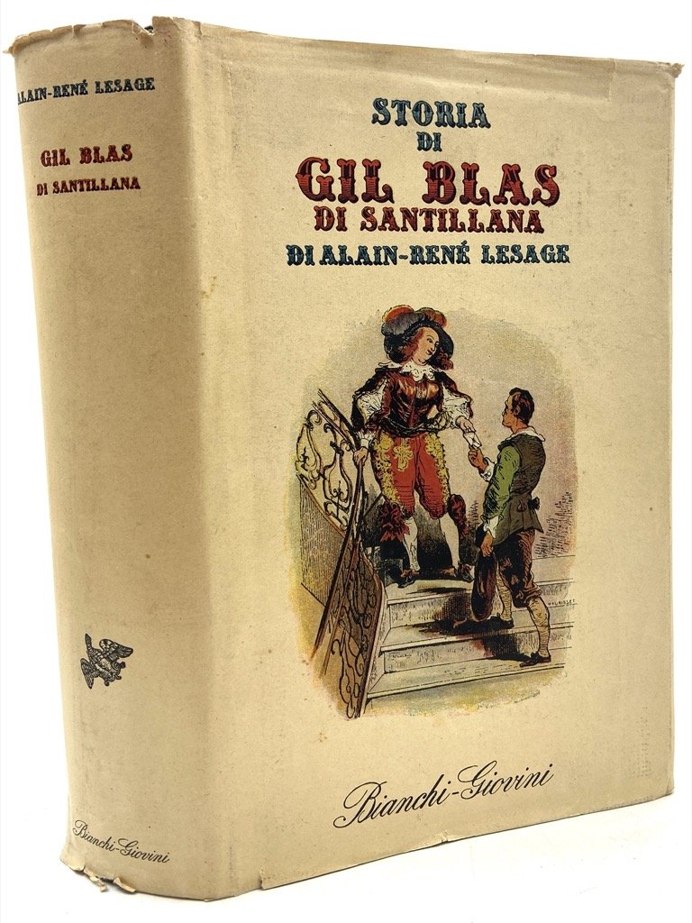 Tela editoriale con sovraccoperta illustrata, cm 22 x 14.5, pp XVI 698 (6), numerose illustrazioni in nero. Collana Aretusa, Narrativa Classica Italiana e Straniera. Strappi sulla sovraccoperta, peraltro in buono stato. Seconda edizione, stampata il 30 ottobre 1945 dalle Arti Grafiche G. Zacchetti, di questa versione del Gil Blas curata da Carlo Cordié (1910-2002) sulla base della traduzione anonima pubblicata da Croci nel 1873 e corredata di illustrazioni di Jean Gigoux dall'edizione parigina del 1835. Ugo Dettore (1910-1992), scrittore e traduttore, collaborò con Bompiani presso cui concepì il progetto del grande Dizionario letterario e in quella sede conobbe la moglie Bianca Ugo (1910-1982), traduttrice dal tedesco e l'inglese molto attiva negli anni '30 per Corticelli, Corbaccio, Mondadori, Elettra e lo stesso Bompiani. Sposati nel 1938 Dettore e Ugo fondarono nel 1942 una propria casa editrice intitolandola ad Aurelio Bianchi-Giovini, pubblicista anticlericale dell'Ottocento e nonno di Dettore. La Casa Editrice Bianchi-Giovini fu improntata al recupero di classici e alla traduzione di letterature straniere, patendo non pochi fastidi da parte del regime che spesso non concesse i nulla osta di pubblicazione e addirittura ordinò il sequestro e macero del Satyricon pubblicato nel 1943. La coppia si avvalse peraltro della collaborazione di intellettuali antifascisti quali Ada Prospero Gobetti e Massimo Mila, e nel 1944 fu brevemente incarcerata dai tedeschi a San Vittore. L'ambizioso progetto della Bianchi-Giovini partì con due collane di Saggistica letteraria («Europa») e letteratura («Aretusa»), e con l'Enciclopedia della Donna curata da Bianca Ugo; oltre a Dettore e Ugo, e ai succitati Prospero e Mila, tra i collaboratori della casa editrice ricordiamo Carlo Cordié, Mario Praz, Carlo Bo, Salvatore Fiume. L'ambizioso progetto editoriale, nonostante la pubblicazione nel dopoguerra di molti dei titoli bloccati dal regime, rimase largamente incompiuto e nella collezione Aretusa videro la luce solo 15 delle 150 opere previste. La separazione della coppia e le difficoltà economiche rallentarono molto i lavori; negli anni '50 Ugo Dettore iniziò a collaborare con Garzanti e la casa editrice Bianchi-Giovini, ormai proprietà della sola Bianca Ugo, languì fino a chiudere i battenti nel 1958. La curatissima collezione Aretusa resta una preziosa testimonianza di una delle più interessanti avventure editoriali italiane del '900.