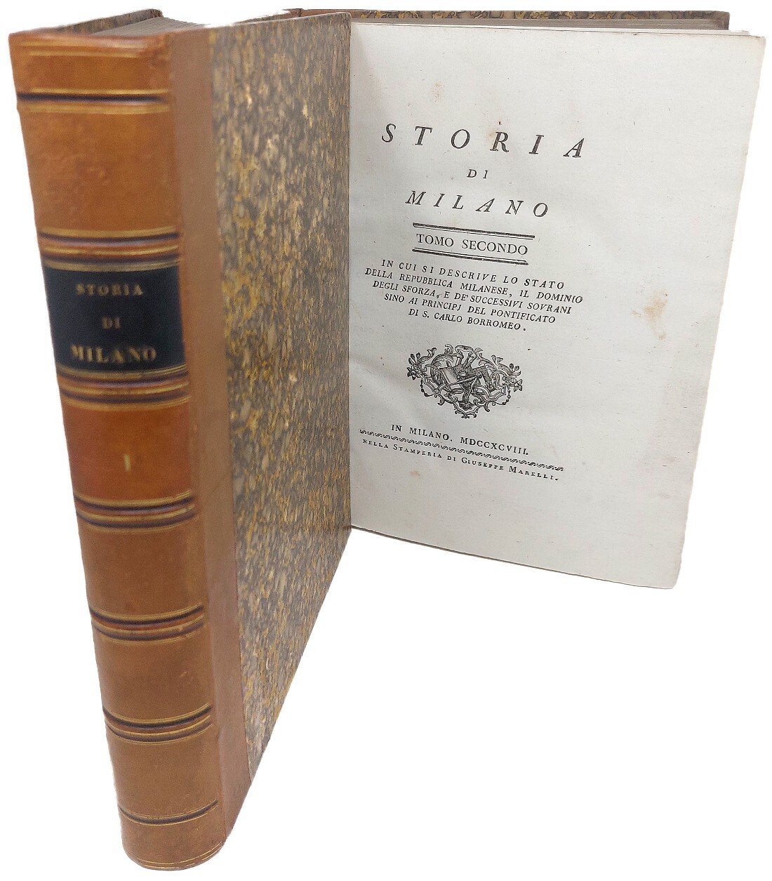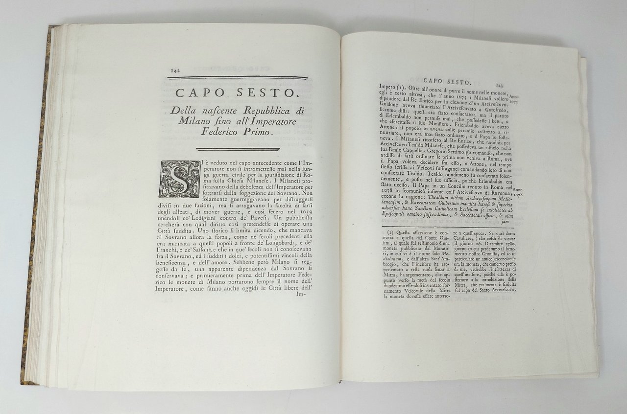 >2 volumi in-4 (mm 290x240), pp. XII, 519; (4), 476, impresse su carta forte. Ottima legatura ottocentesca in mezza pelle, dorsi a nervi con filetti oro e titoli su tasselli, carta marmorizzata sui piatti, taglio superiore dorato. Vignetta silografica sui titoli, iniziali ornate e fregi nel testo, una pianta topografica della città, una tavola genealogica dei Visconti, 6 belle tavole di vedute e costumi ripiegate incise in rame dal Cagnoni. Prima edizione, dedicata da Verri all'arciduca Ferdinando d'Austria, Governatore della Lombardia. Unitamente alle storie della città del Corio e del Giulini, la presente è tra le più importanti di Milano. Il I volume narra "dai tempi remoti sino alla fine del Dominio dei Visconti". L'altro volume:"lo stato della Repubblica Milanese, il Dominio degli Sforza, fino al principio del "pontificato" di S.Carlo Borromeo. Il Verri poté pubblicare solo la prima parte della storia, sino all'anno 1524. Antonio Francesco Frisi curò e copletò il secondo volume, dato alle stampe quindici anni dopo il primo nel 1798. In fine di entrambi i tomi vi è un vasto e dettagliato indice delle materie. Esemplare assai bello, marginoso ed estremamente fresco (Ex-libris "proprietà privata di sua maestà il Re Vittorio Emanuele II"). Predari 197. Cat. Hoepli 967 Gamba 2490. Manca a Lozzi, Platner, Cat. Meneghina.