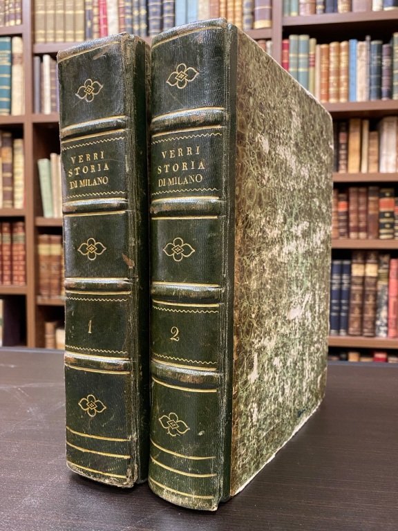 2 volumi in-4° (cm. 24,3), legatura di poco successiva in mezza pelle verde con titolo e fregi in oro ai dorsi (abrasioni ai piatti); pp. XII 519 [1b]; [4] 475 [1] con 1 pianta topografica 5 tavole (di 7) fuori testo incise dal Cagnoni; capilettera silografici; integrazioni maldestre alle ultime carte. Prima edizione della storia di Milano del celebre letterato ed economista milanese, uno dei padri dell'illuminismo lombardo e italiano. Quest'opera su Milano può essere considerata la prima con impostazione storiografica moderna, e la sua seconda parte a distanza di anni fu conclusa e pubblicata postuma da Antonio Francesco Frisi, fratello del grande matematico Paolo. Oltre alla «Pianta della Città di Milano», con legenda, le belle tavole incise da Cagnoni raffigurano: «Le colonne di San Lorenzo» (p. I,20), l'«Atrio della Basilica di S. Ambrogio» (p. I,48), la «Torre di S. Gottardo» (p. I,334), la «Casa de' Signori Conti Marliani» (p. II,83); mancano qui le 2 tavole «Ballerini Milanesi del 1580» e «Dama e Cavaliere Milanesi del 1580» (p. II,337). Cfr. Hoepli 967 che cita un ritratto del Verri in medaglione non riscontrato in nessun'altra bibliografia o copia consultata. [cfr. Predari 198; Gamba 2490; Brunet V, 1147; Graesse VI, 287]. Esemplare solo discreto. (SN1)