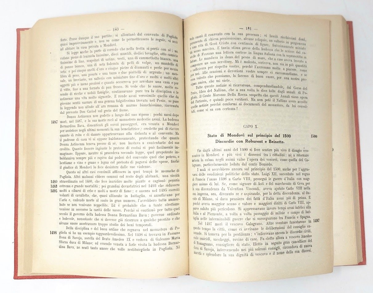 >in-8, pp. 600, leg. tutta tela rossa, tit. oro. Opera edita a cura del sacerdote Pietro Arbinolo. Importante resoconto della storia di Mondovì dall'epoca preromana al 1918. Non comune. Buon esemplare, salvo restauro al verso del frontespizio e strappetto marginale all'ultimo foglio.