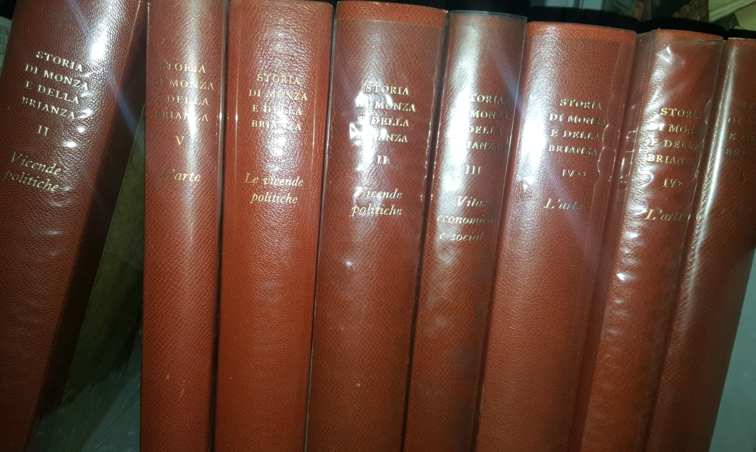 >6 volumi, in-4, Vol. I: pp.396 (2), (17 tavole in b/n f.t.); Vol. II: pp 410 (2), (19 tavole in b/n f.t.); Vol. III: pp. 307 (2), (17 tavole in b/n f.t.); Vol. IV*: pp. 271 (4), con 123 tavole in b/n n.t., (6 tavole a colori f.t.); Vol. IV**: pp. 485 (2), con 176 tavole in b/n n.t., (6 tavole a colori f.t.); Vol. V: pp. 306, (2) con 210 tavole in b/n n.t., (8 tavole a colori f.t.); legatura in mezzo marocchino e tela con titolo in oro al dorso, taglio superiore dorato. Edizione speciale in 900 esemplari impressi su carta filigranata. La collana si compone di: Vol. 1: G. Barni e altri, Le vicende politiche, dalla preistoria all'eta sforzesca, 1973 - - Vol. 2: Dino Bonomi e Isabella Superti-Furga, Le vicende politiche, dal dominio straniero all'Italia unita, 1979 - - Vol. 3: Sergio Zaninelli, Vita economica e sociale, 1969 - - Vol. 4 (in due tomi): L. Caramel, M. Mirabella Roberti, G. Anzani e altri, L'arte, dall'età romana al Rinascimento, 1976 - - Vol. 5: Rossana Bossaglia, L'arte, dal Manierismo al primo Novecento, 1970.