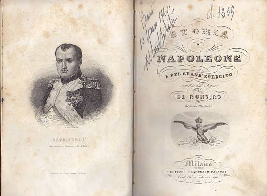 STORIA DI NAPOLEONE E DEL SUO GRAND’ESERCITO del signor De Norvins. OPERA COMPLETA IN DUE VOLUMI. Milano, l’editore Francesco Pagnoni, senza data (ma 1840). 576 + 446 pagine, 55 bellissime incisioni fuori testo (vedi foto sotto) e due facsimili di lettere ripiegati fuori testo.