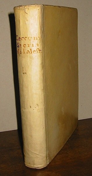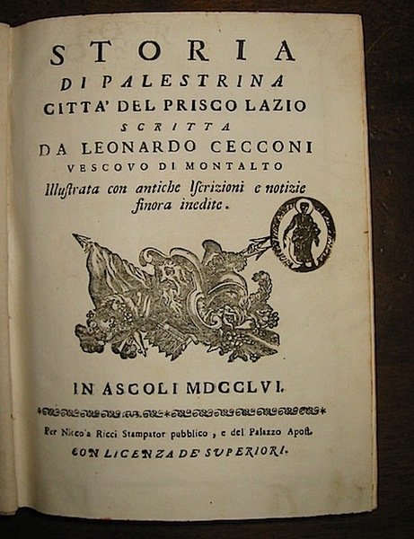 4to (cm. 23,8), XVI-431(5) pp. con una grande mappa più volte rip. del Territorio Prenestino antico e moderno. Capilettera figurati. Legatura coeva in pergamena rigida con titolo ms. al ds. (piccola fenditura alla cerniera anteriore). Tagli colorati. Timbretto di bibl. estinta al frontis. Eccellente esemplare. Lozzi, n. 3331: ‘Non comune’; Ranghiasci, p. 134. Provenienza: Collezione Pocino.